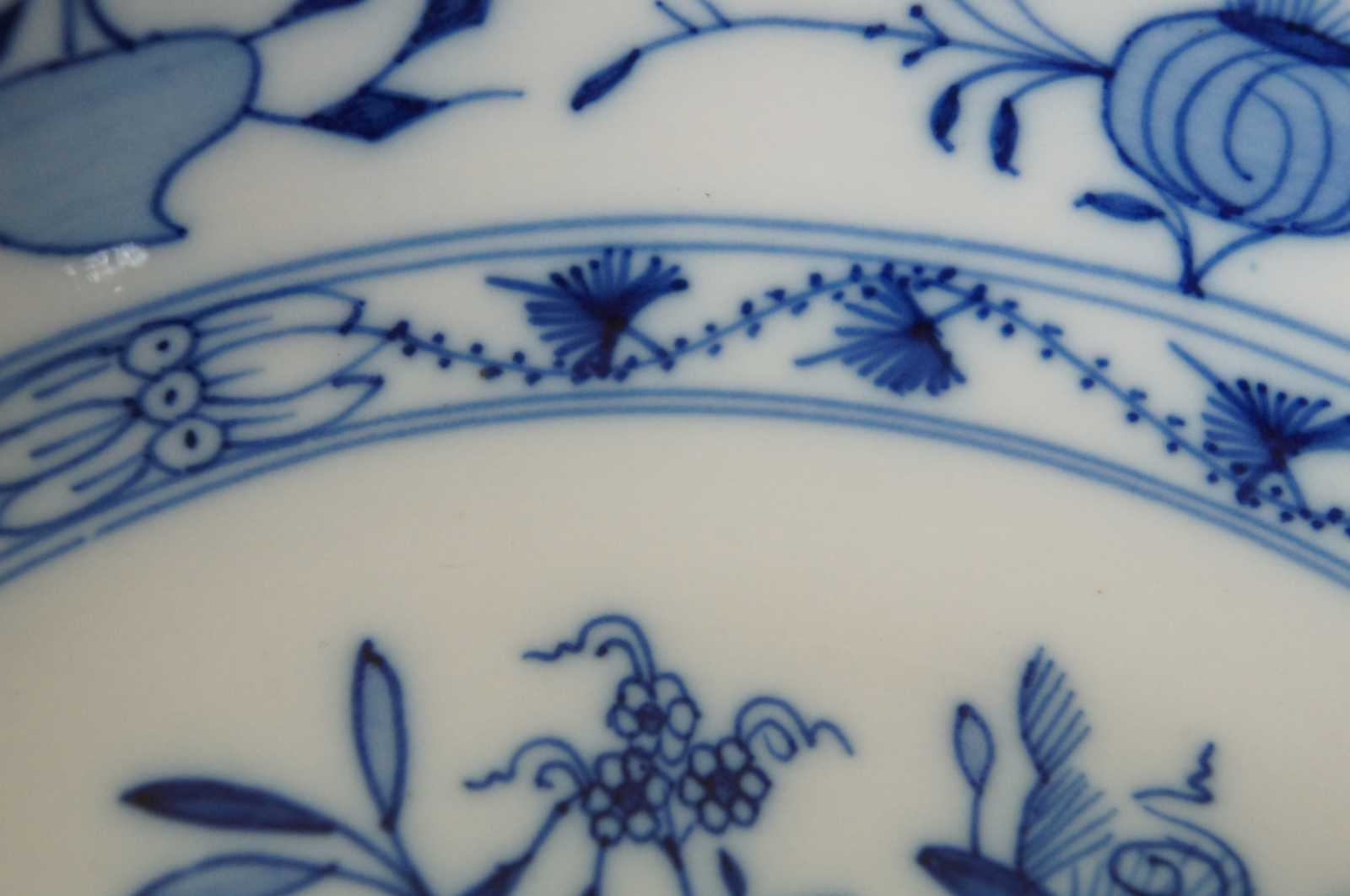 Antique Carl Teichert cobalt blue and white porcelain shallow soup bowl by Meissen in the ""blue onion"" pattern.