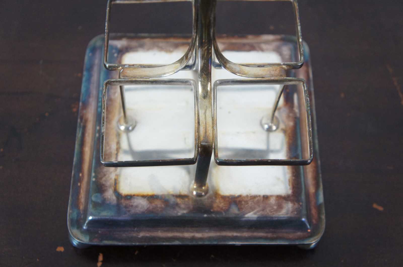 Antique Victorian silverplated stand cruet set and caddy (stand) with square faceted glass bottles, two with glass stoppers, one shaker and one jam pot. Marked on base GCW EPNS. Salt & Pepper / Oil &Vinegar