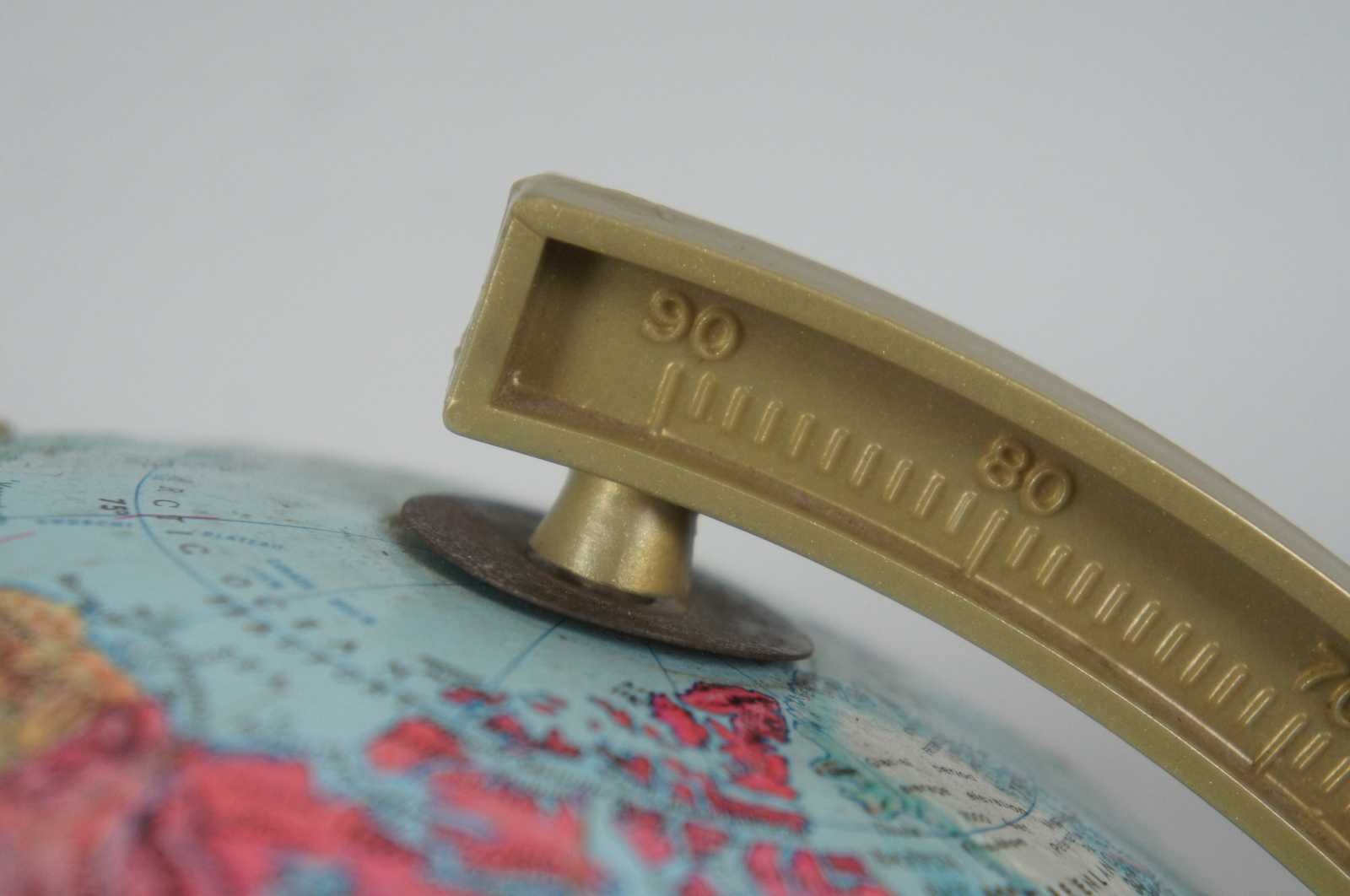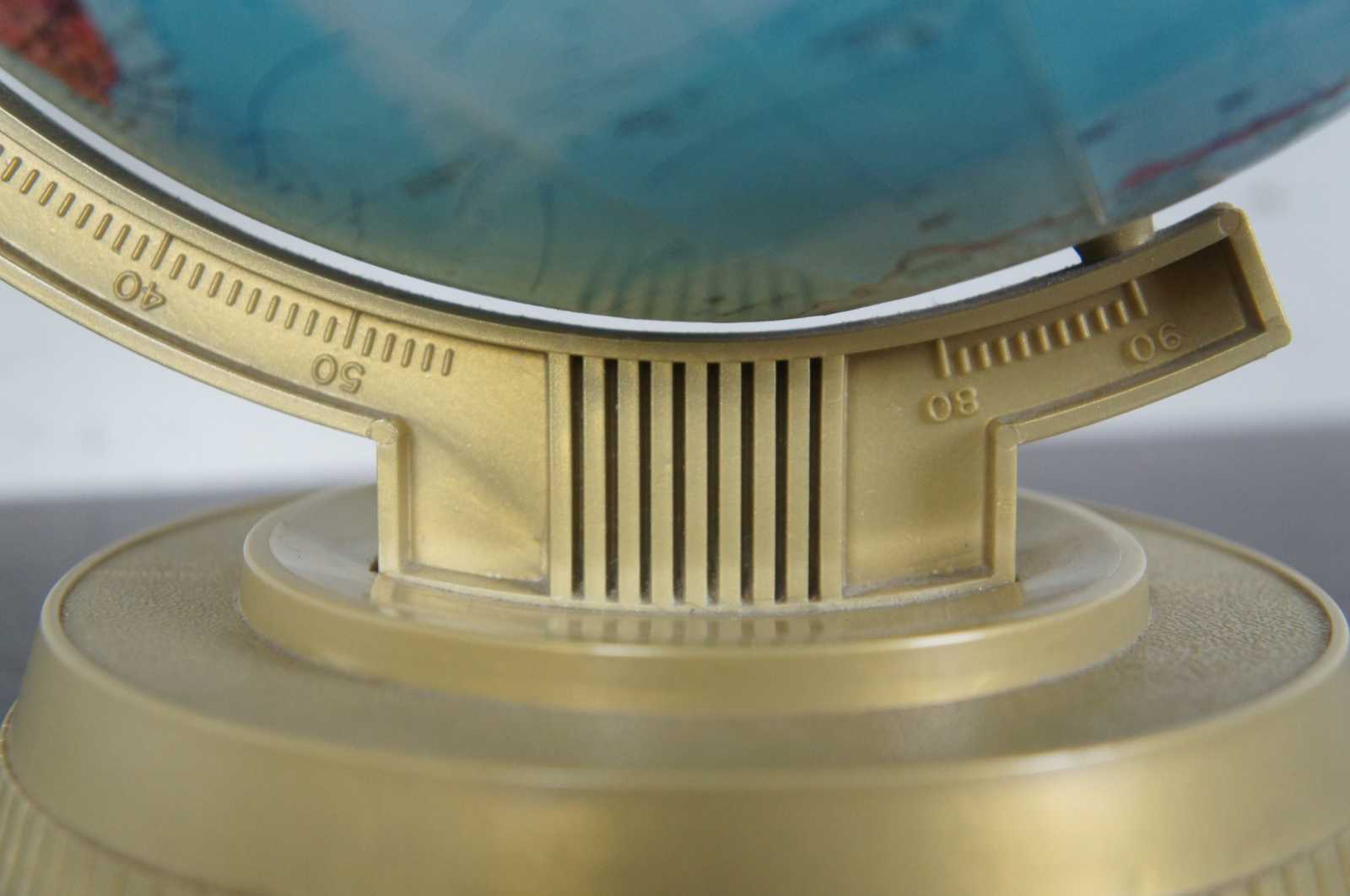 Vintage nine inch diameter World Scholar Series desk globe by Replogle Globes, supported on a gold plastic stand.