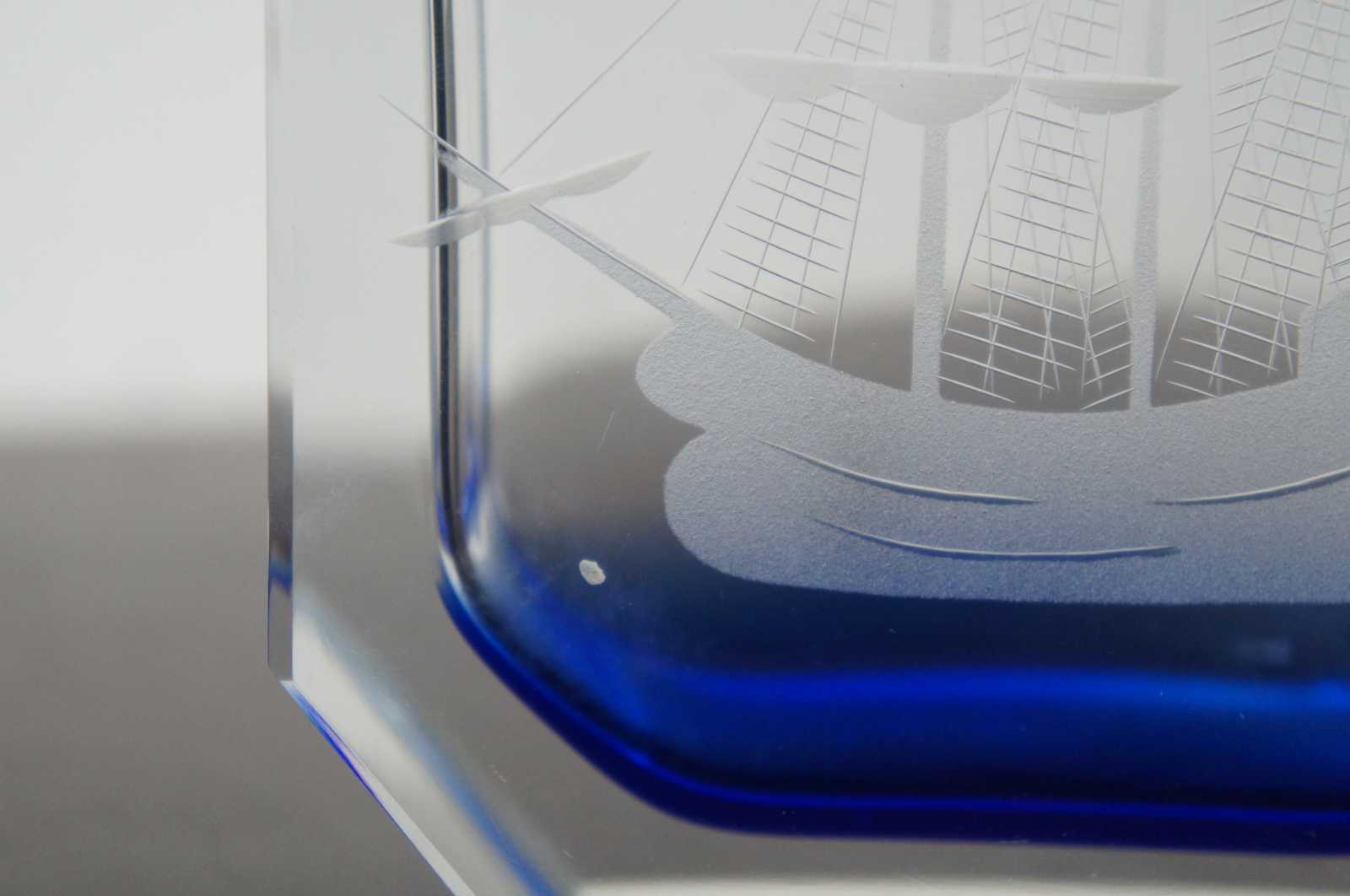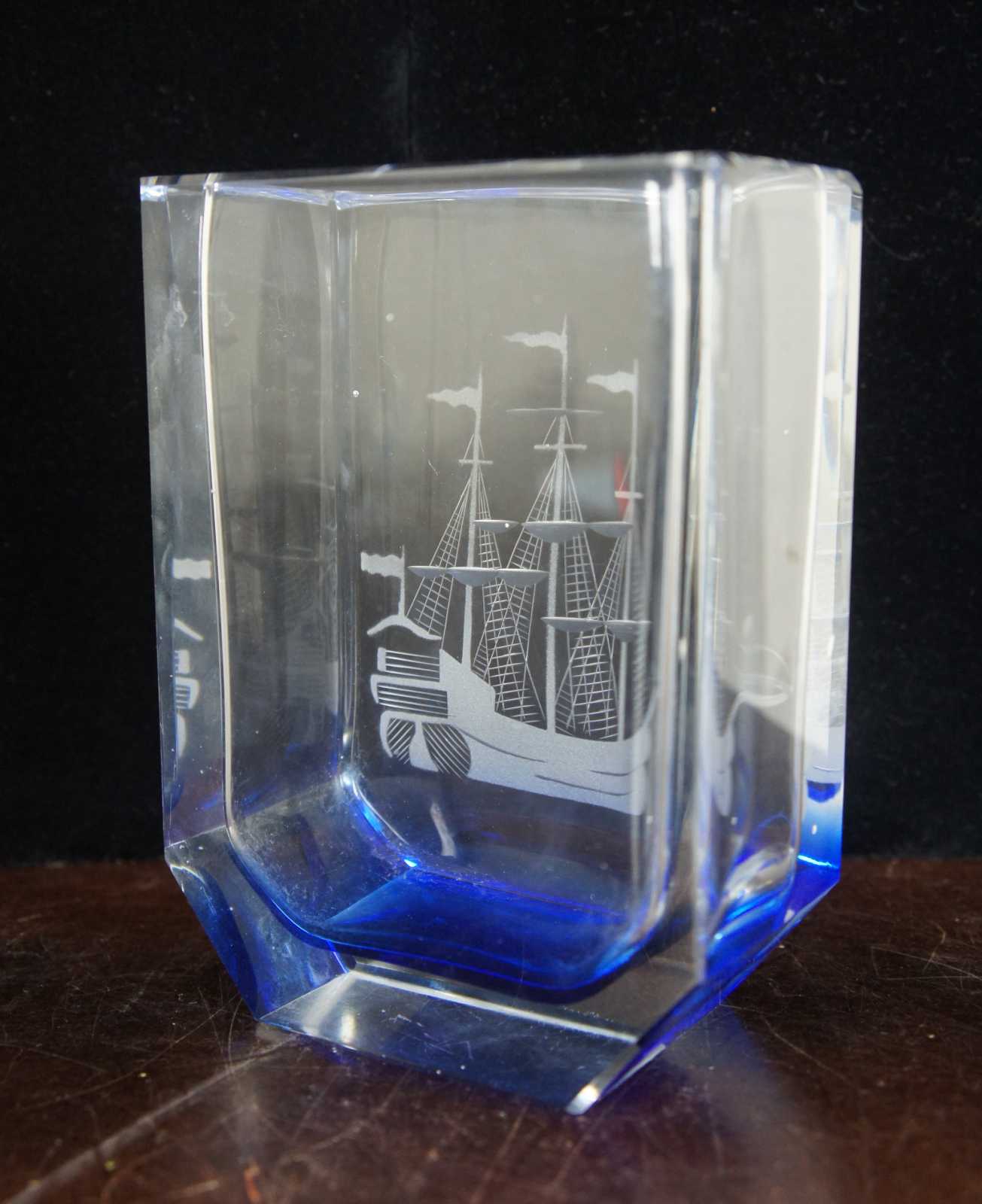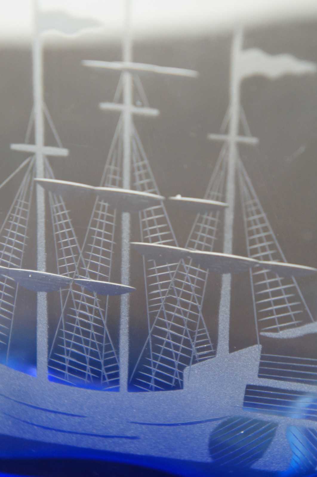 Vintage glass vase with a cobalt blue base emphasizing the etched gallion / boat / sail ship design on the side.