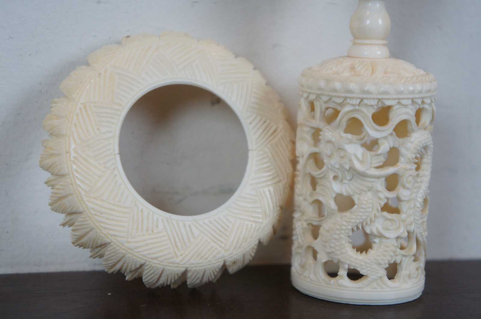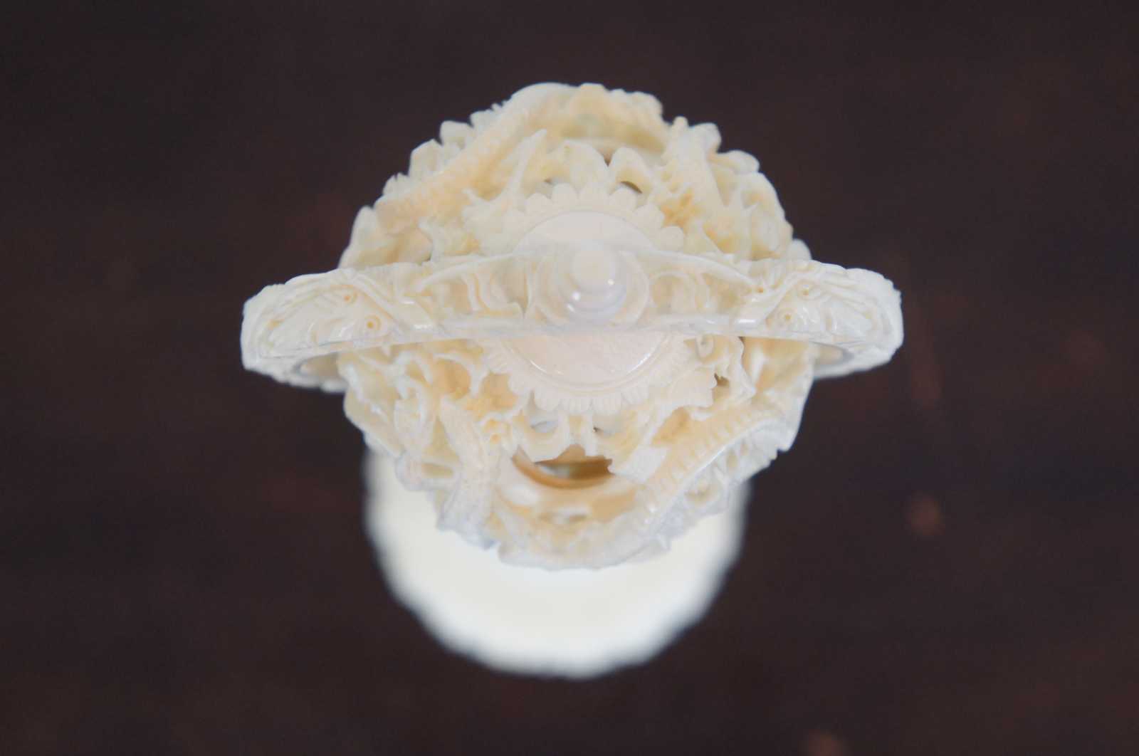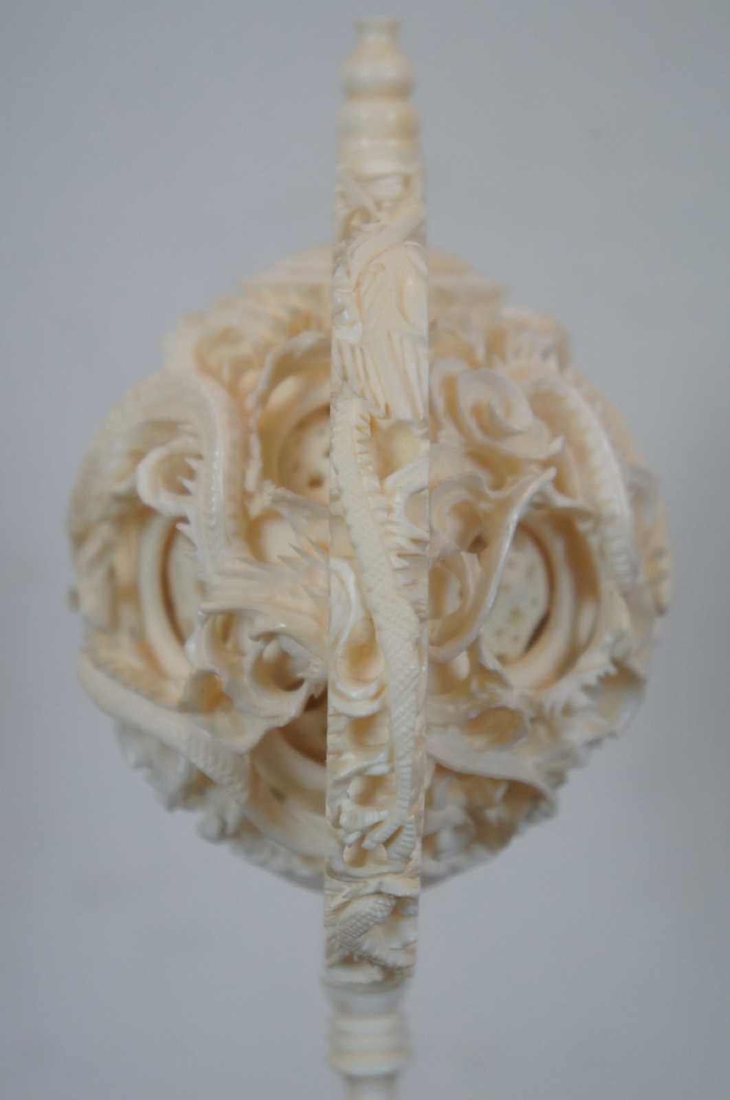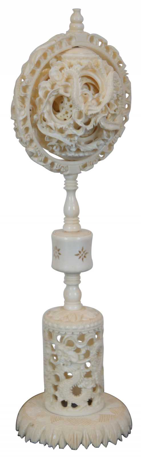 Intricately carved Chinese dragon puzzle ball within ball sculpture and stand. Eight layers.