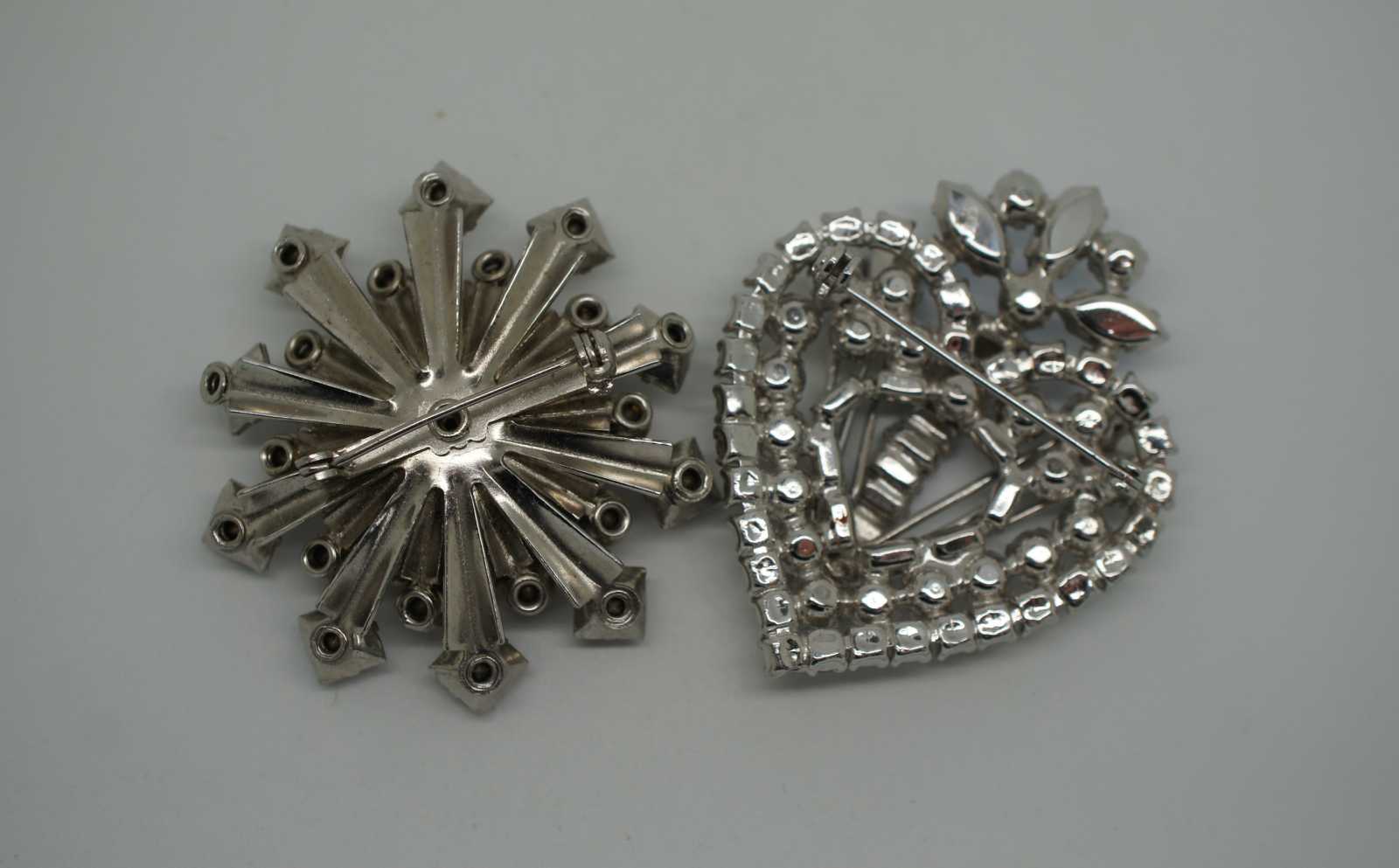 Lot of 5 costume jewelry brooches – green enameled flower, black “carved” floral oval, pink and white rhinestone starburst, blue and white rhinestone heart, and brass filigree with red rhinestones.