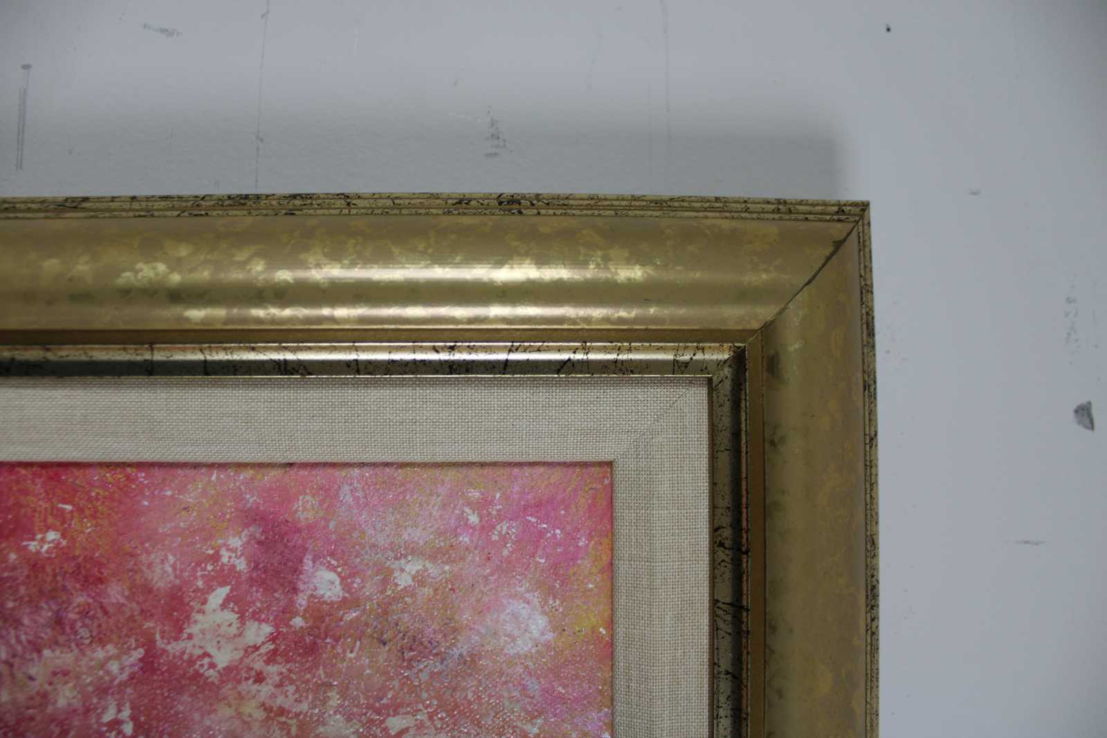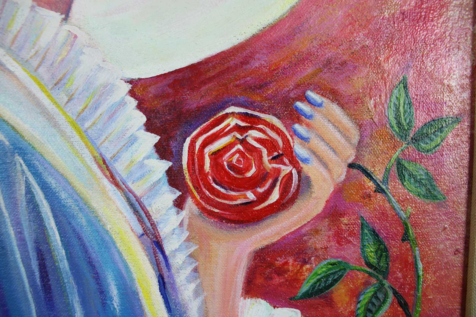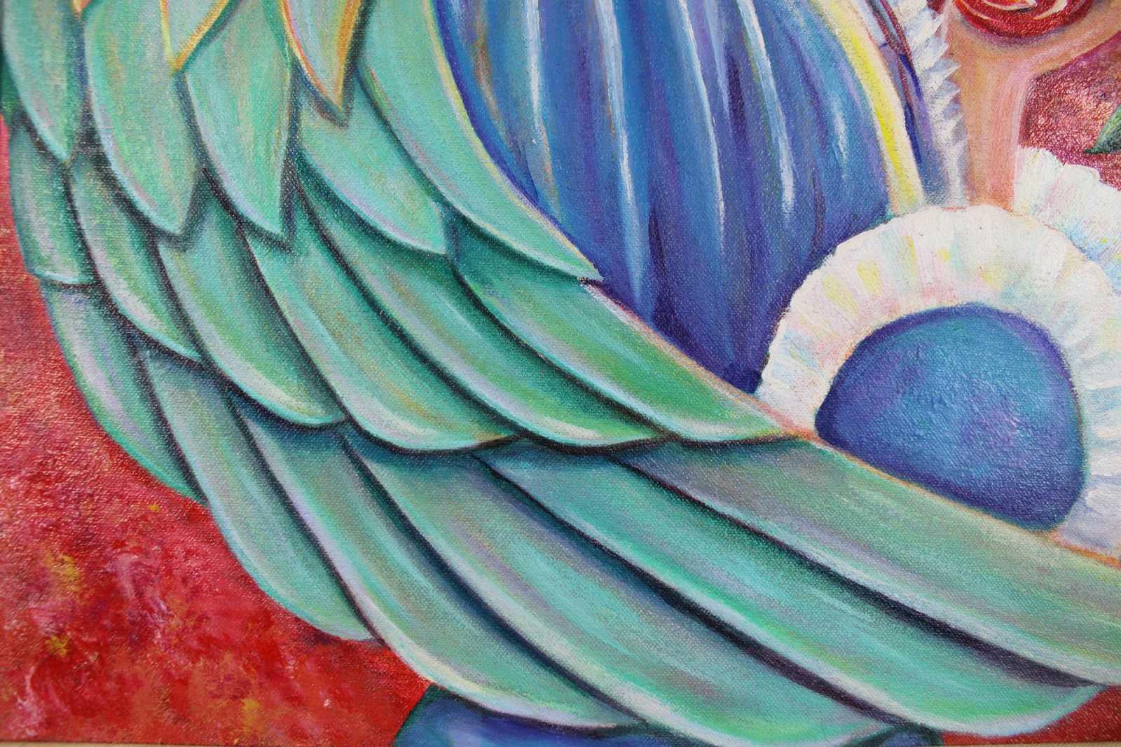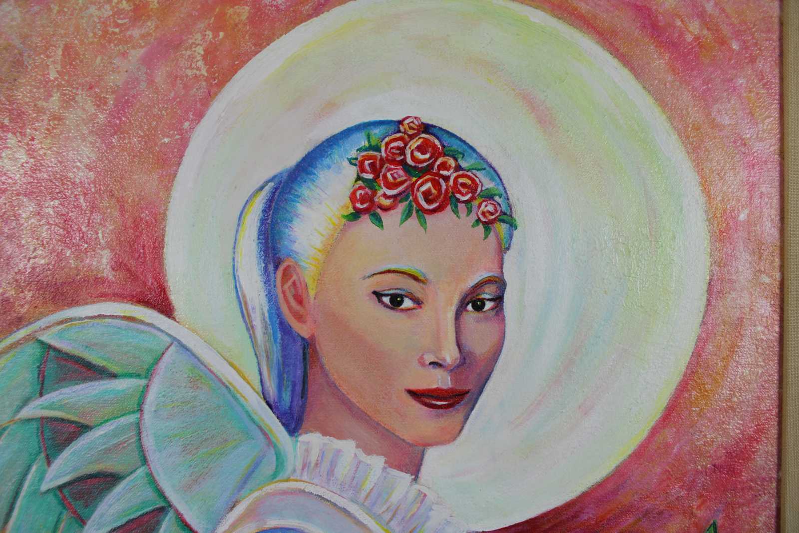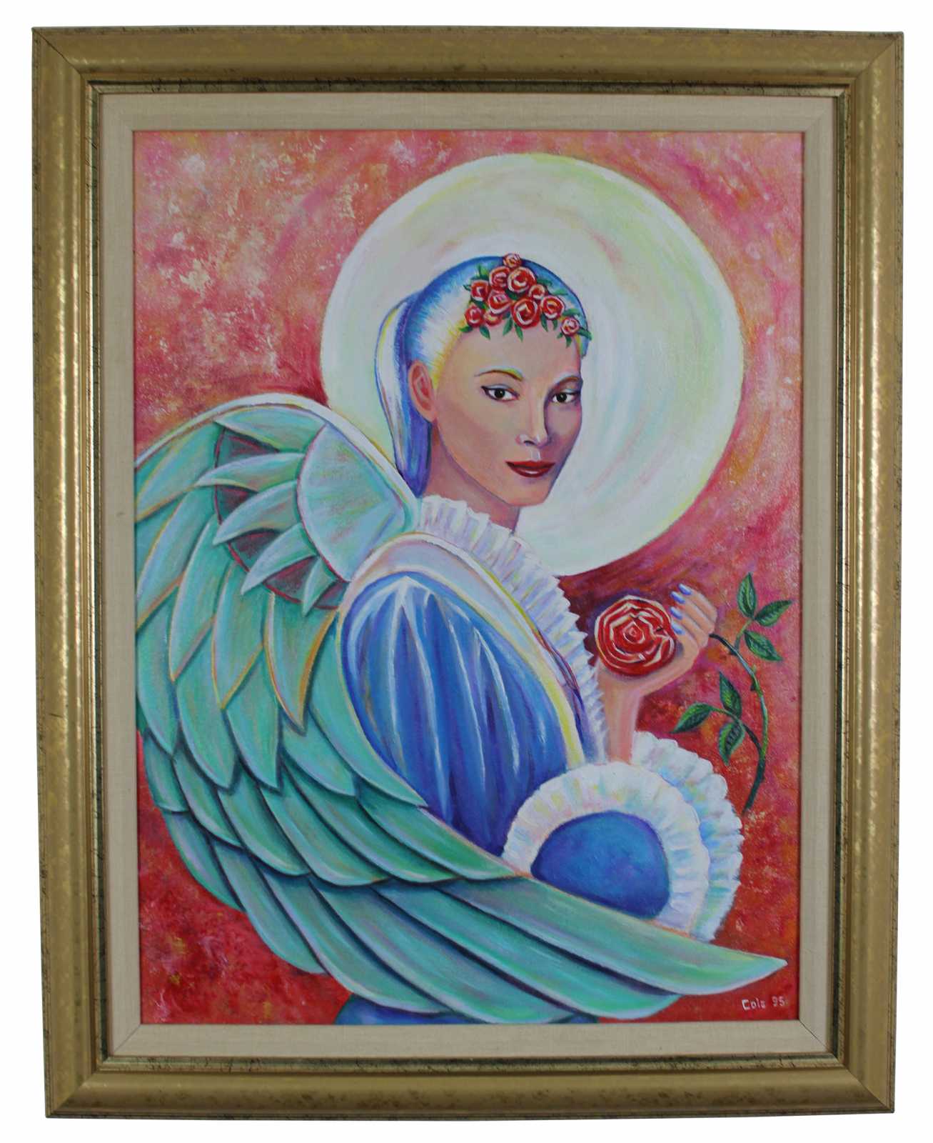 Vintage 1995 Archangel or Guardian Angel oil painting by Cole. Features an Angel of high rank dressed in a royal blue robe with roses, turquoise wings and Halo. Painted in vibrant colors.