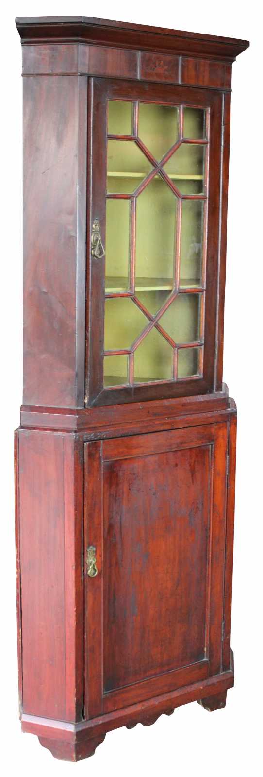 Antique petite Georgian style corner cupboard. Made from Mahogany with a yellow painted interior and brass handles. Display door is ligned in elegant fretwork to neatly display curioisities.
