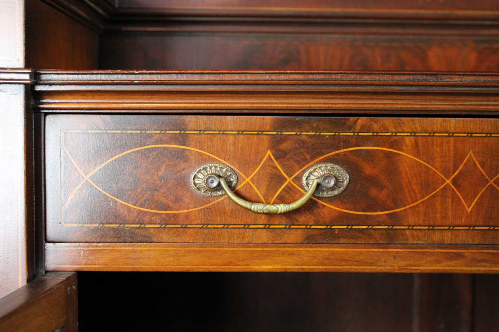 Monumental early 19th century Sheraton library bookcase. Features a central curio cabinet and upper drawer flanked by outer bookcases. Made from crotch (flamed) mahogany with beautifully burled doors, satinwood inlay, diamond pattern fretwork and brass hardware. The cabinet is supported by square tapered legs leading to spade feet.