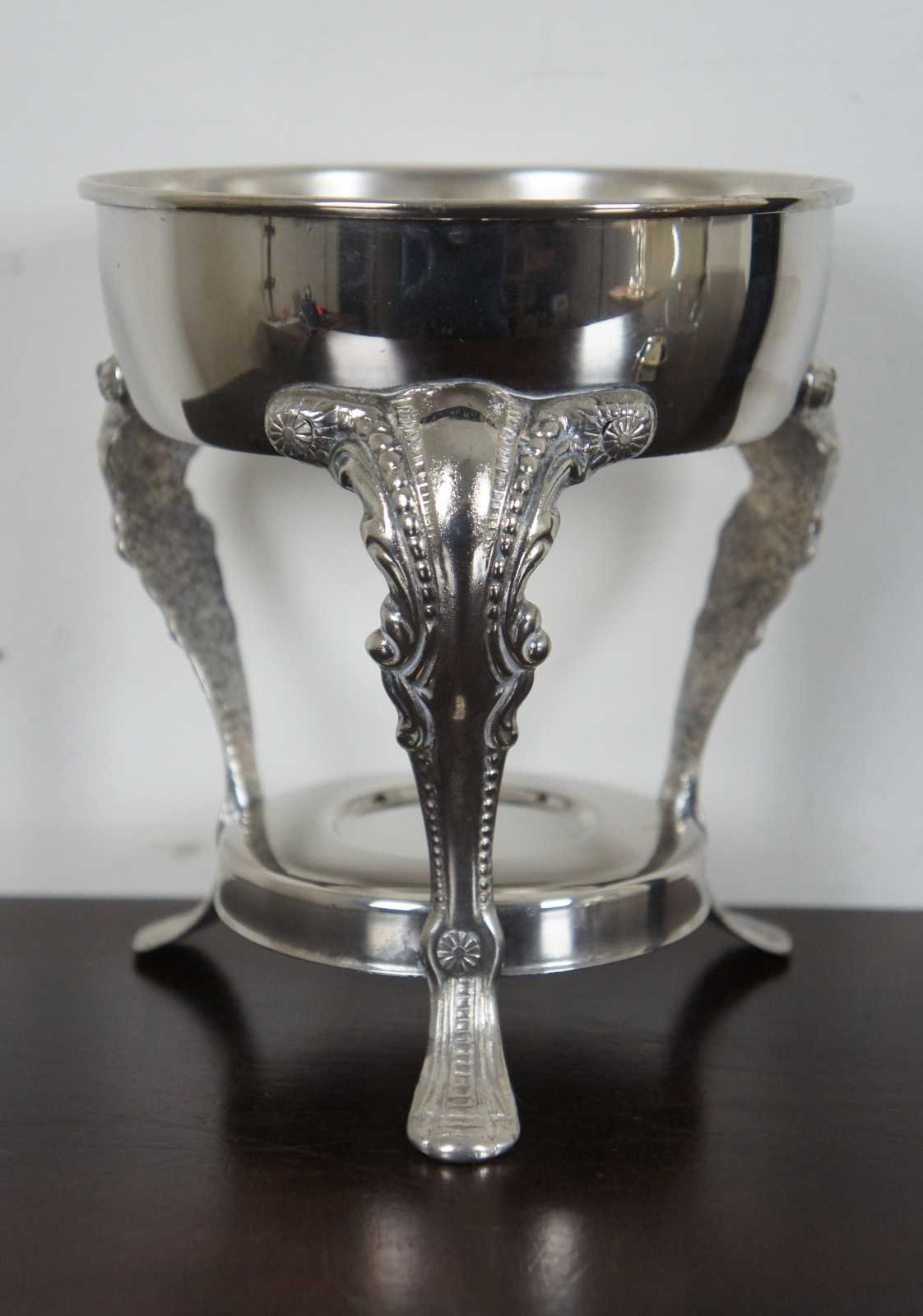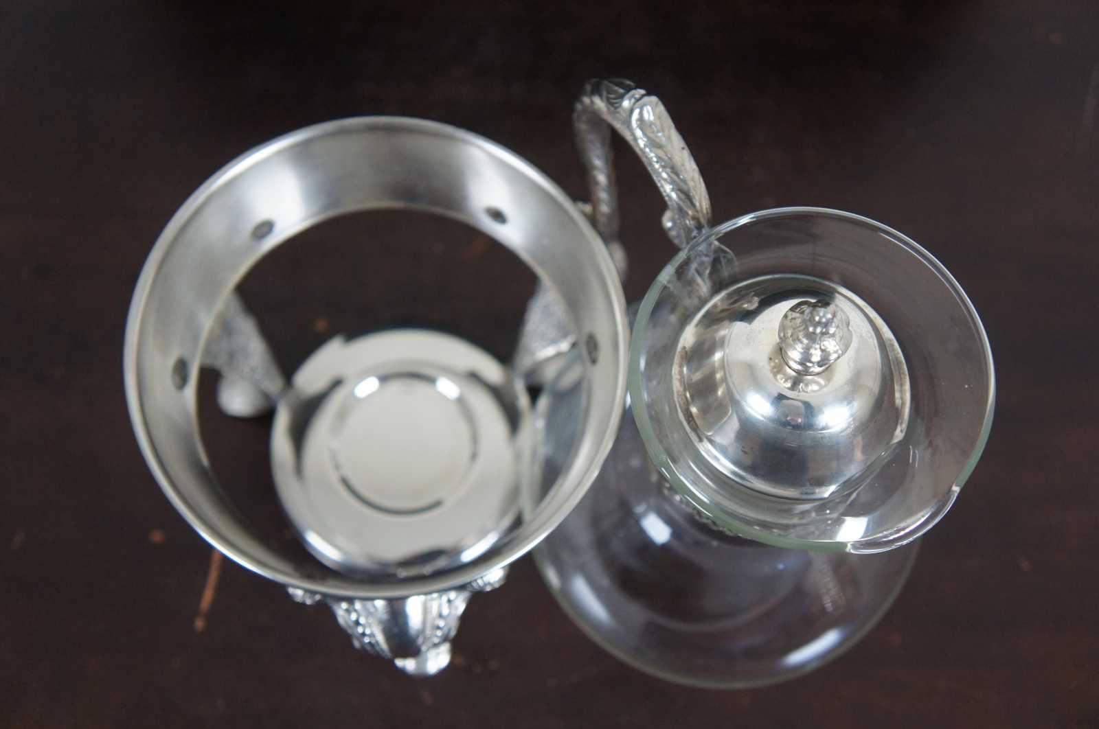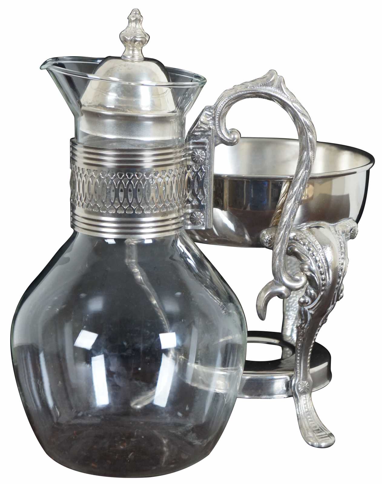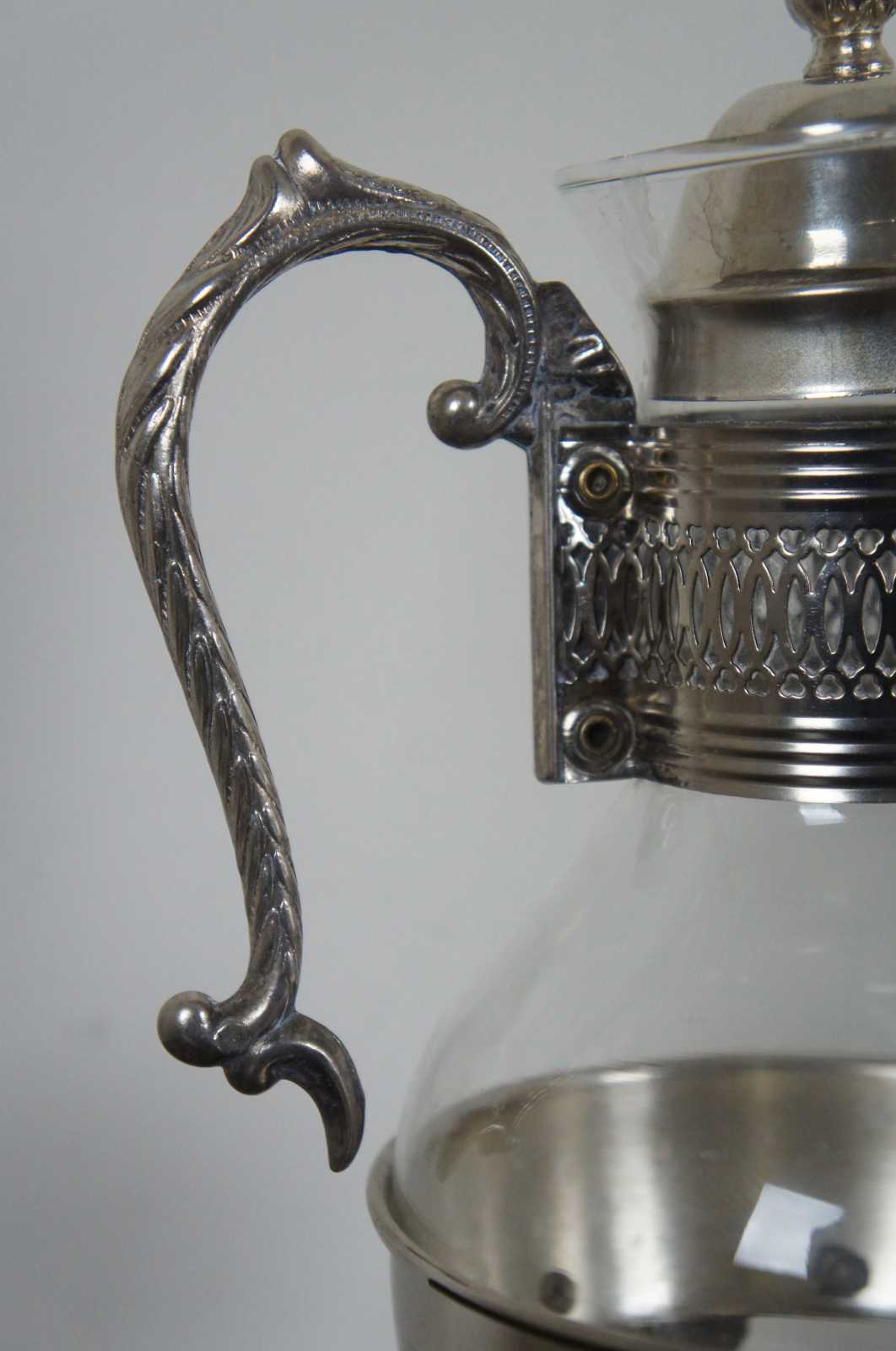 Vintage Corning Brand heat proof glass coffee carafe with silver plate accents, handle, lid and warning stand.