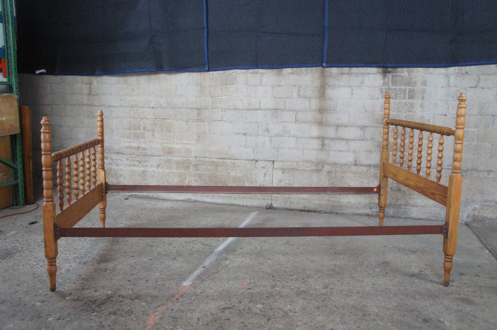 Early 20th century American Pine spindle bed. Features spool turned spindles and iron rails.