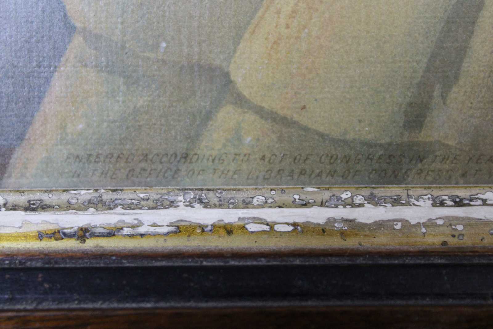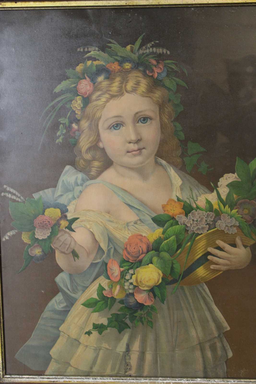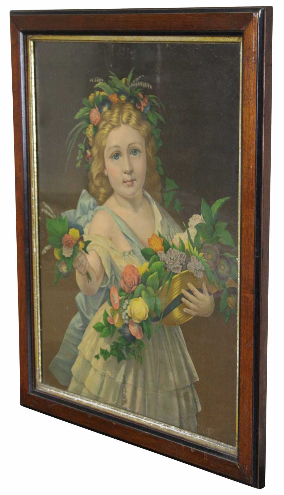 1877 Chomo-lithograph by Strobridges & Company titled Spring Beauties. Features a gracefully dressed young Victorian flower girl. Framed in mahogany with black and gold trim.
