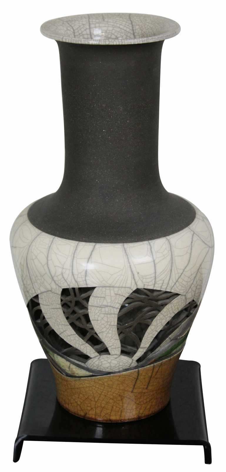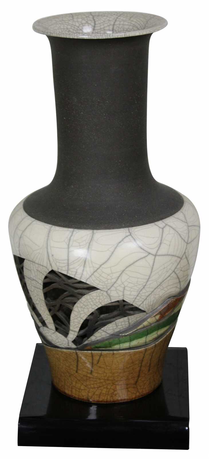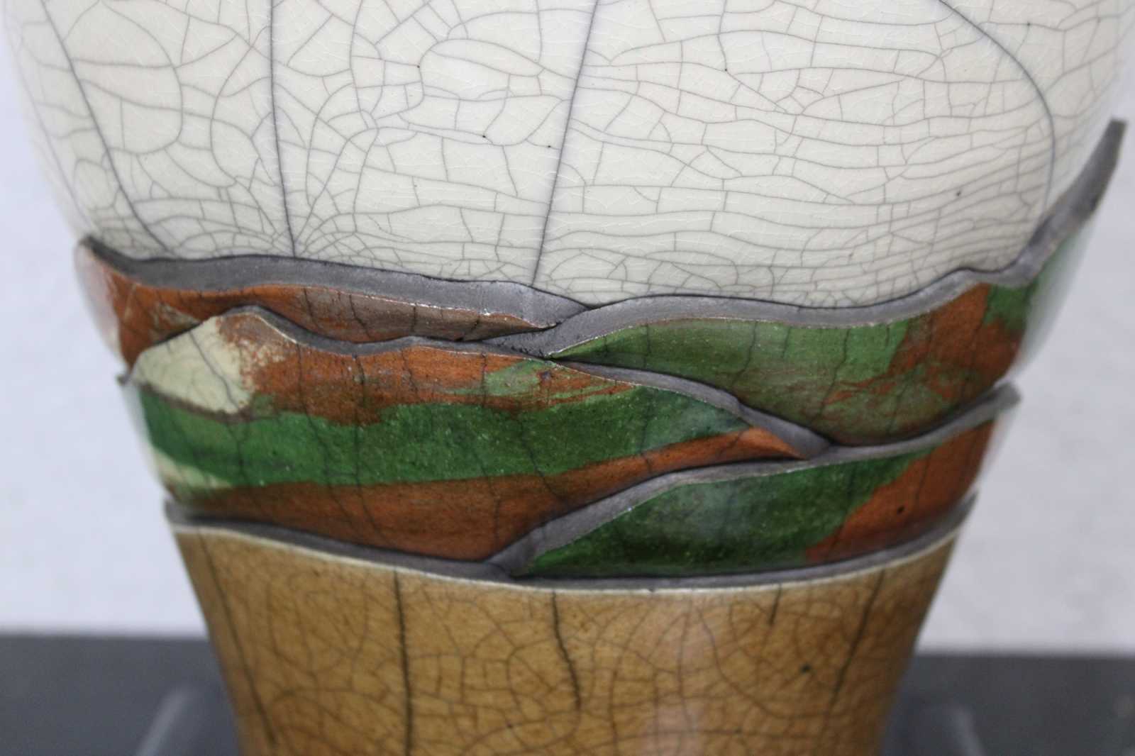 ""Later, color emerged as an important factor with the use of clay colorants mixed with the raku clay body. As science is inseparable from art, I documented each experimental formula until I had achieved a broad spectrum of colors. Using these oxided clays, I have gained control of my medium and can now realize all of the dimensions I visualize.""