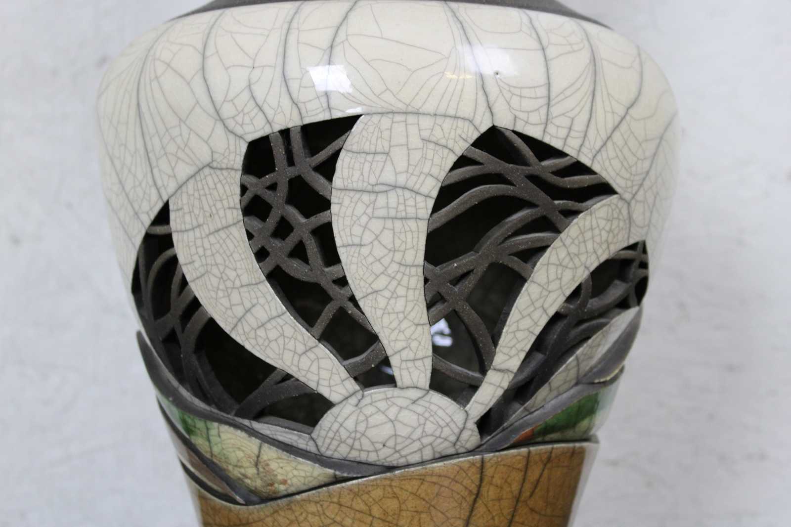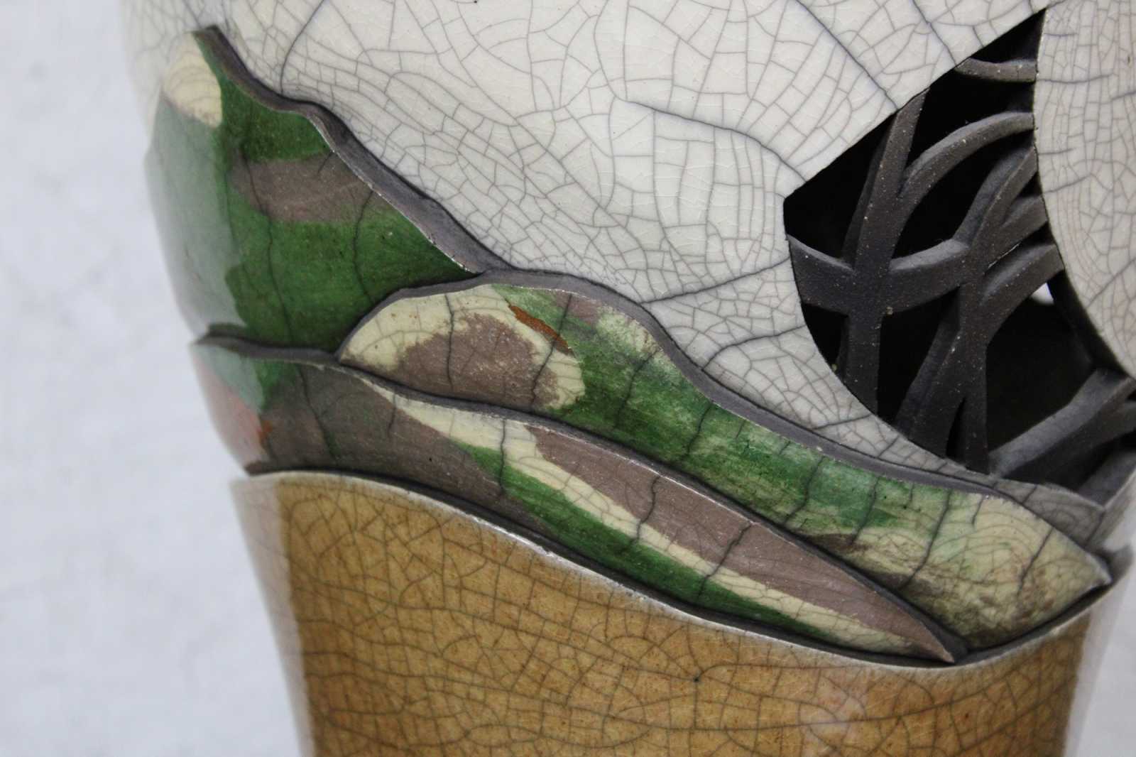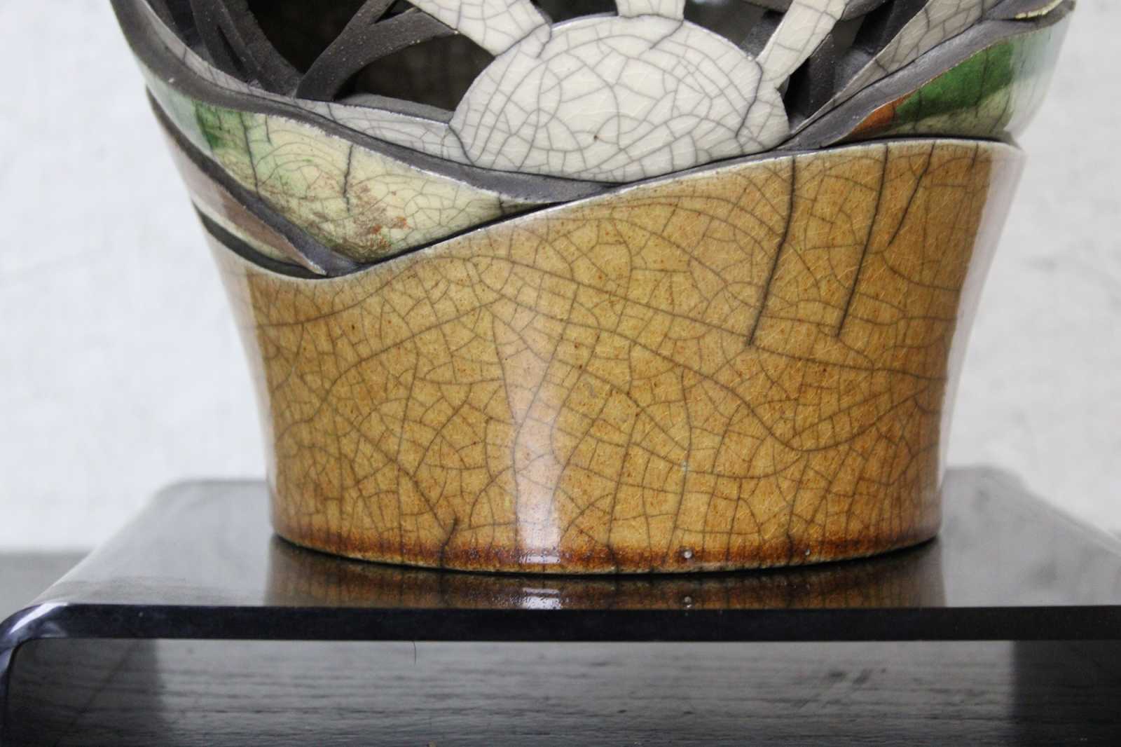 ""Later, color emerged as an important factor with the use of clay colorants mixed with the raku clay body. As science is inseparable from art, I documented each experimental formula until I had achieved a broad spectrum of colors. Using these oxided clays, I have gained control of my medium and can now realize all of the dimensions I visualize.""