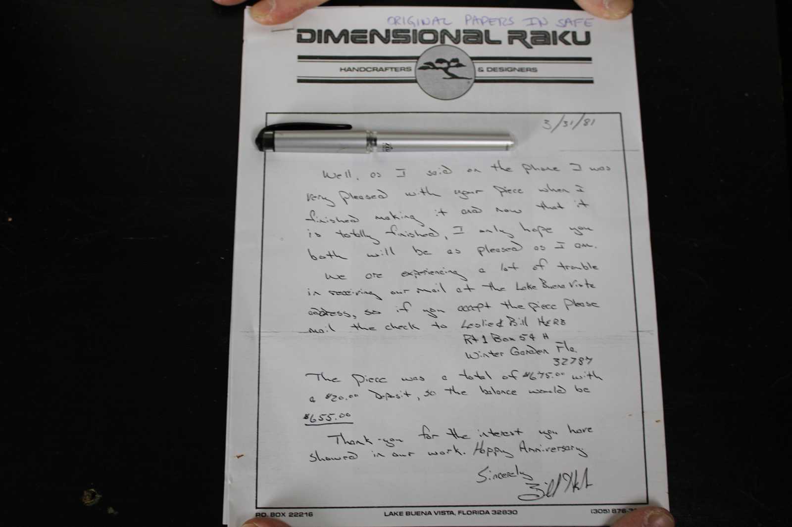Includes copy of letter sent to original buyer when the piece was commissioned / completed.