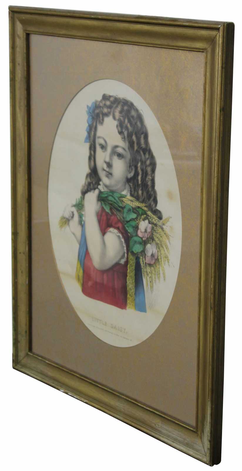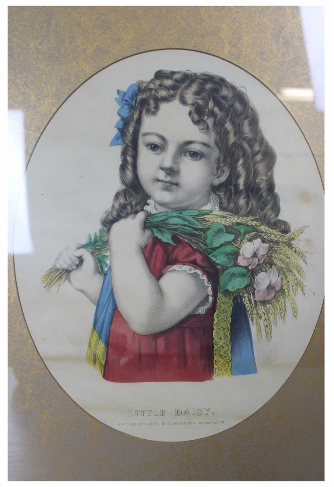Currier & Ives "Little Daisy" Colored Lithograph. Features an oval gold foiled matte and gold frame.