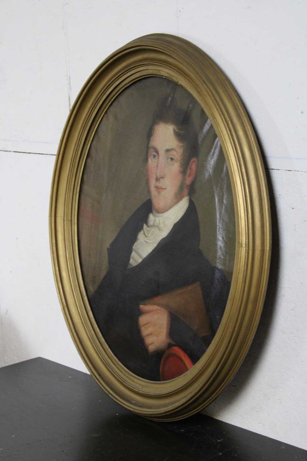 Antique 18th Century oval oil paintings. Features a man and woman (Husband and Wife) dressed in proper attire. Framed in gold.