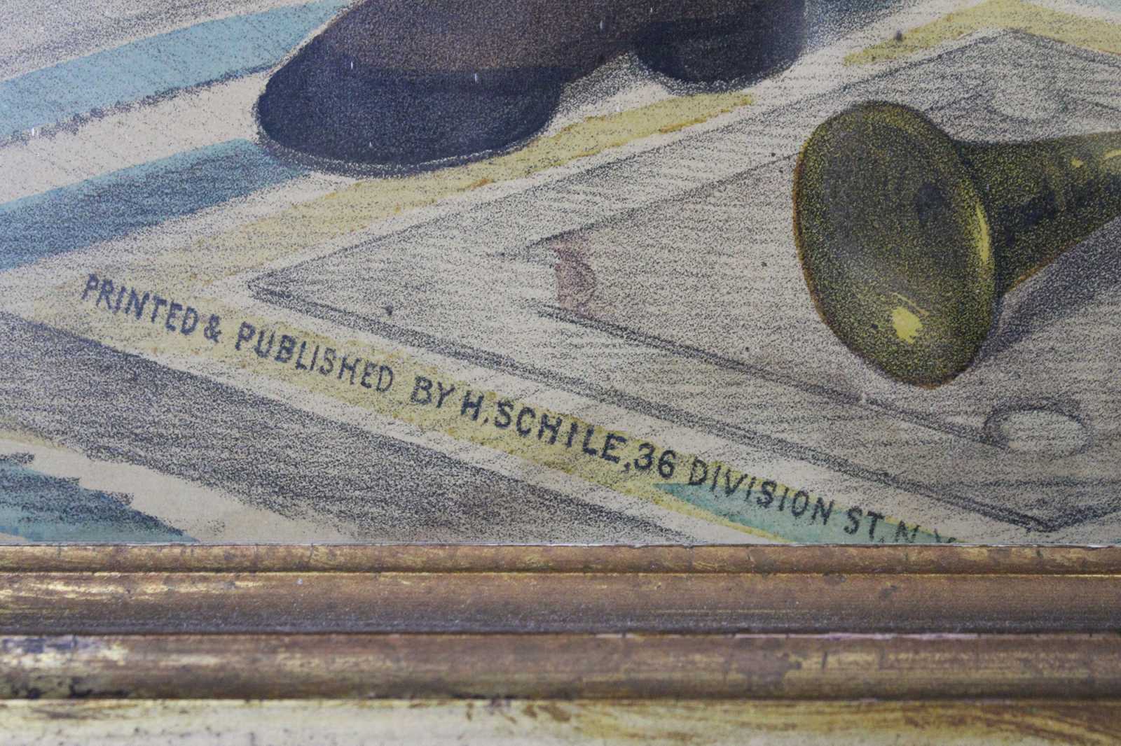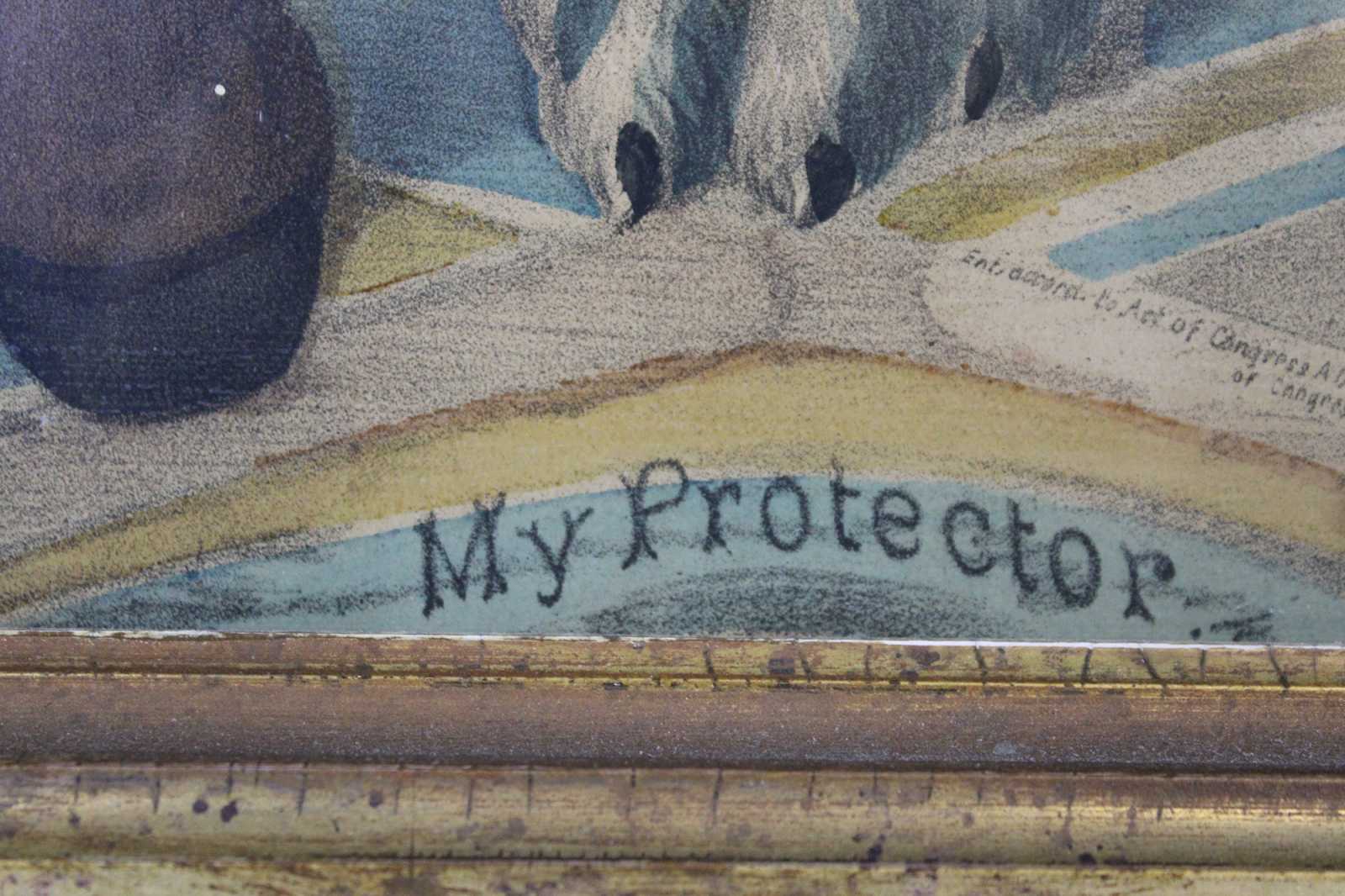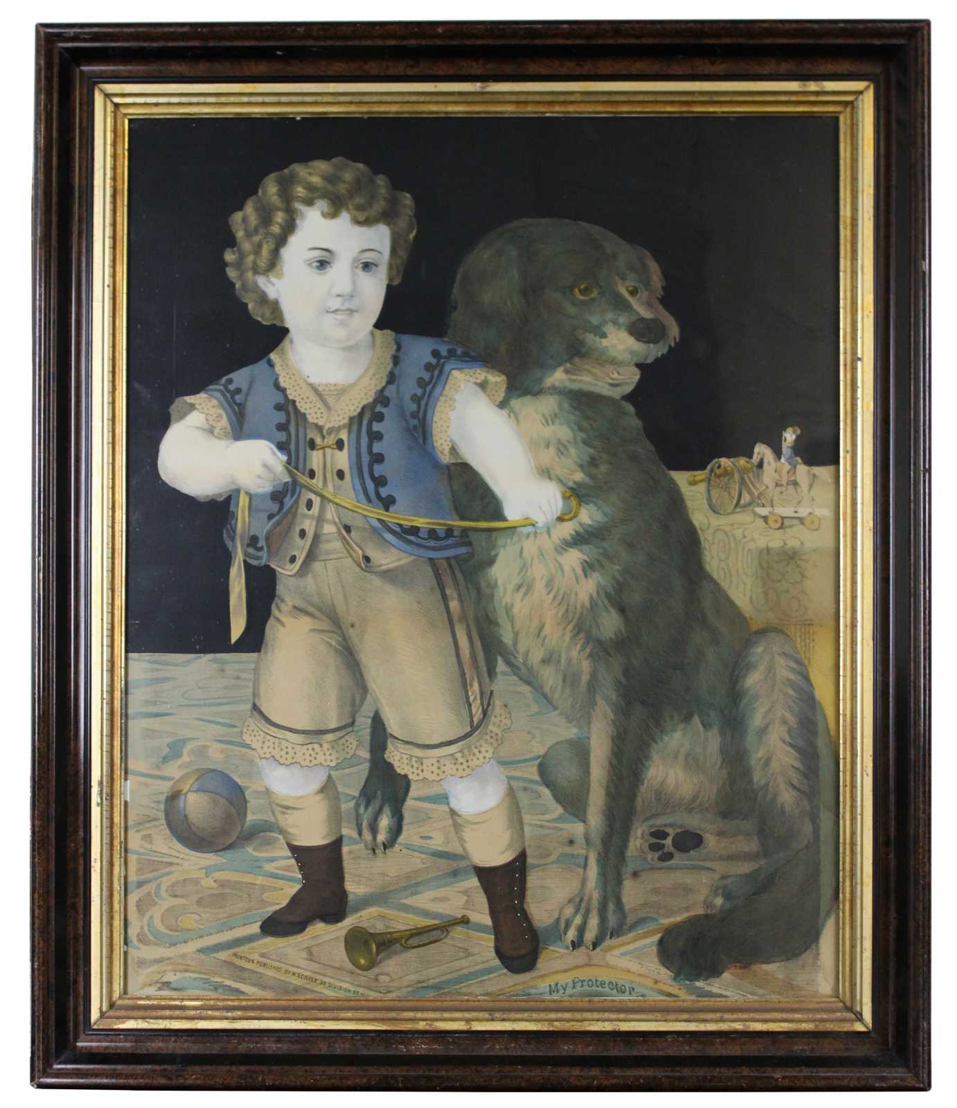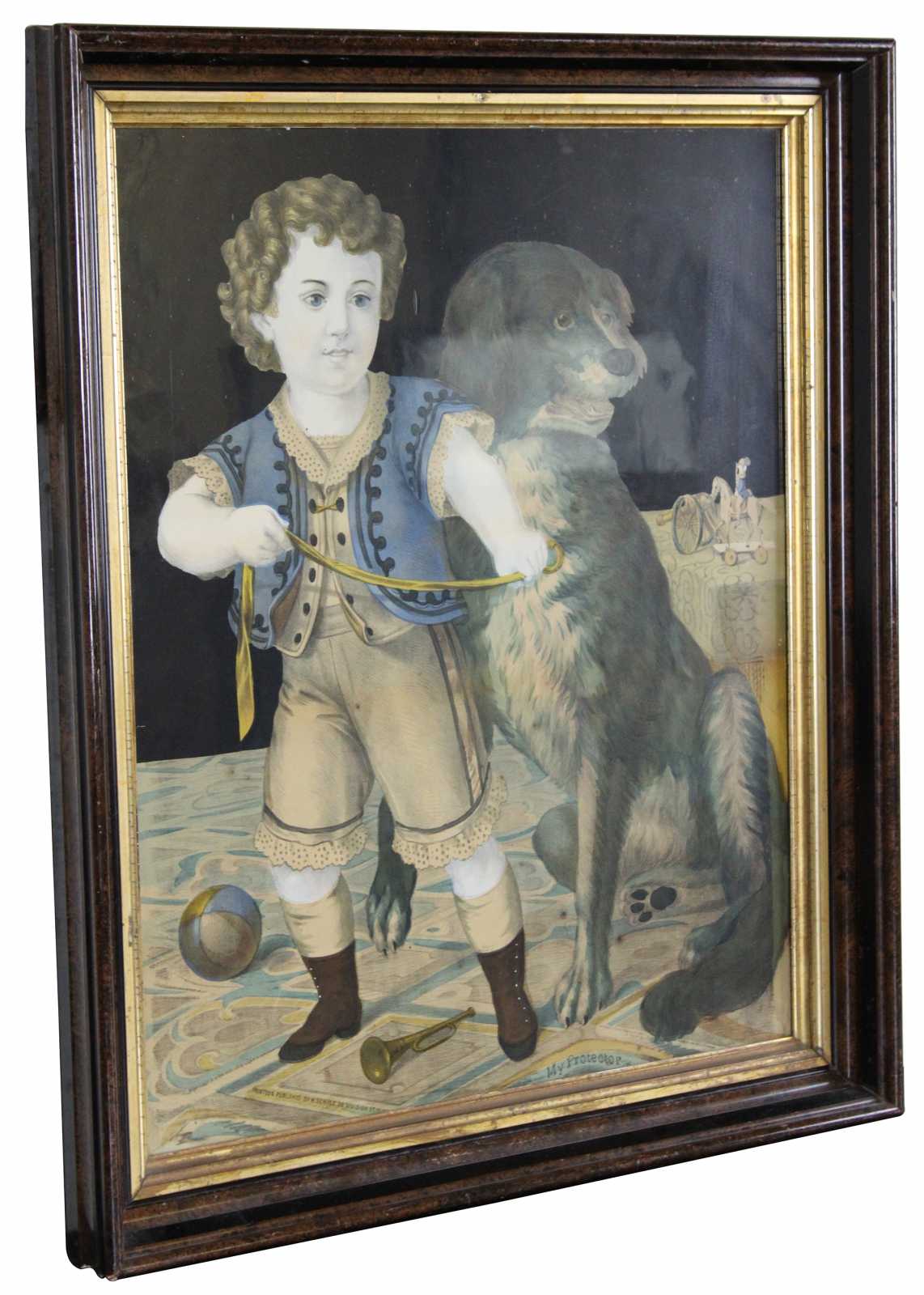 Antique 1874 Henry Schile published lithograph print. Features a boy and his dog, aptly titled ""My Protector"". Framed in period antique gold gilt and burl wood frame and antique glass.