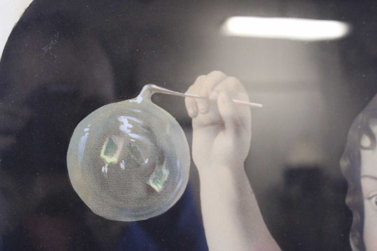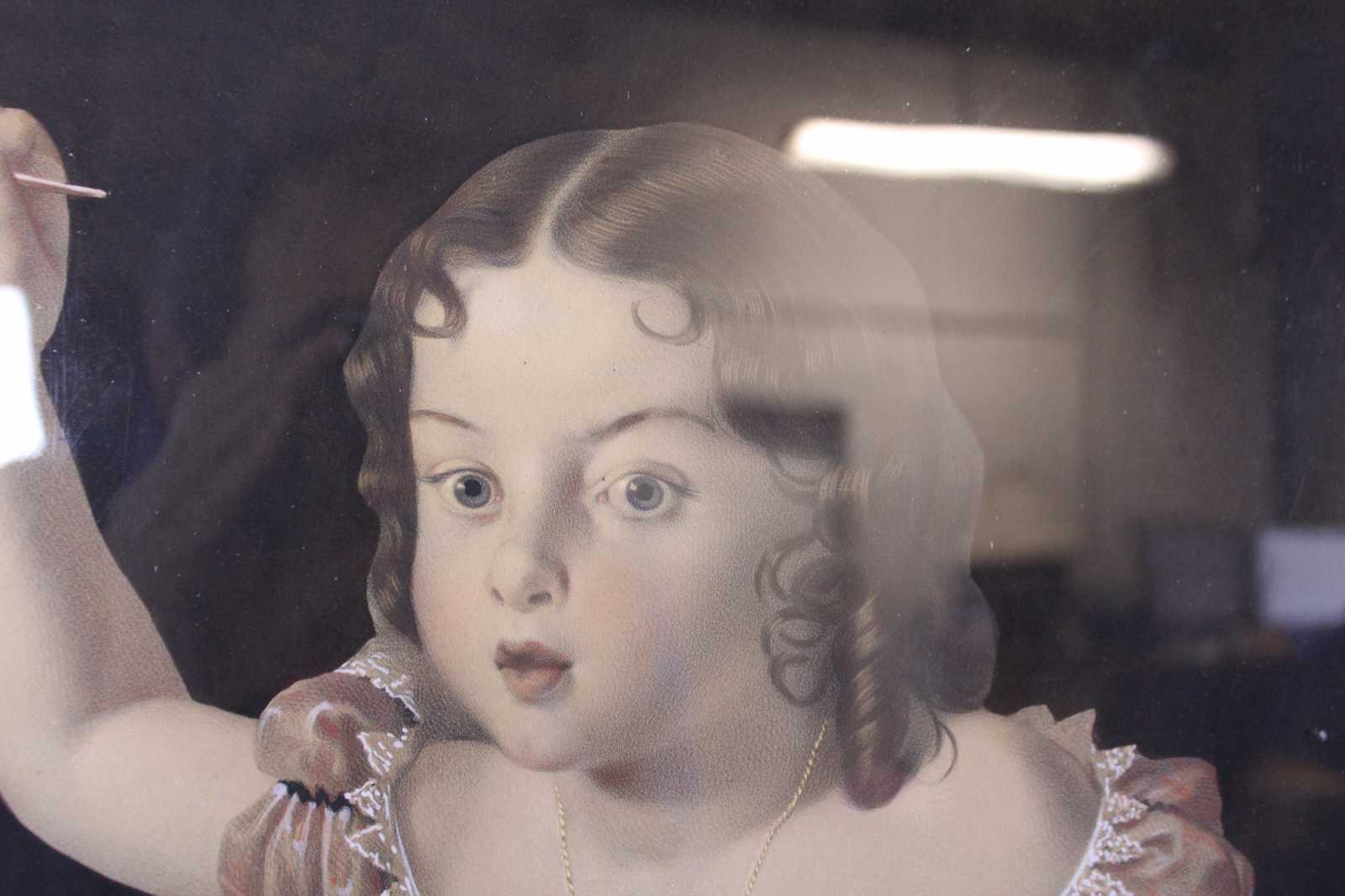 Antique 1856 Cromolithograph (lithograph) print by William Schaus, LM Spencer and Lafosse. Titled "Oh!". Features a girl in a dress blowing / making bubbles. Framed in period antique gold gilt wood frame with antique glass. Printed by L.M. Spencer, Published by Schaus, Lithograph by Lafosse.