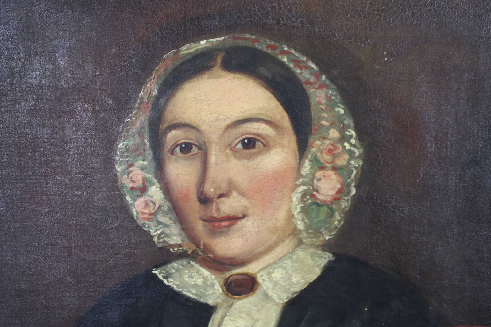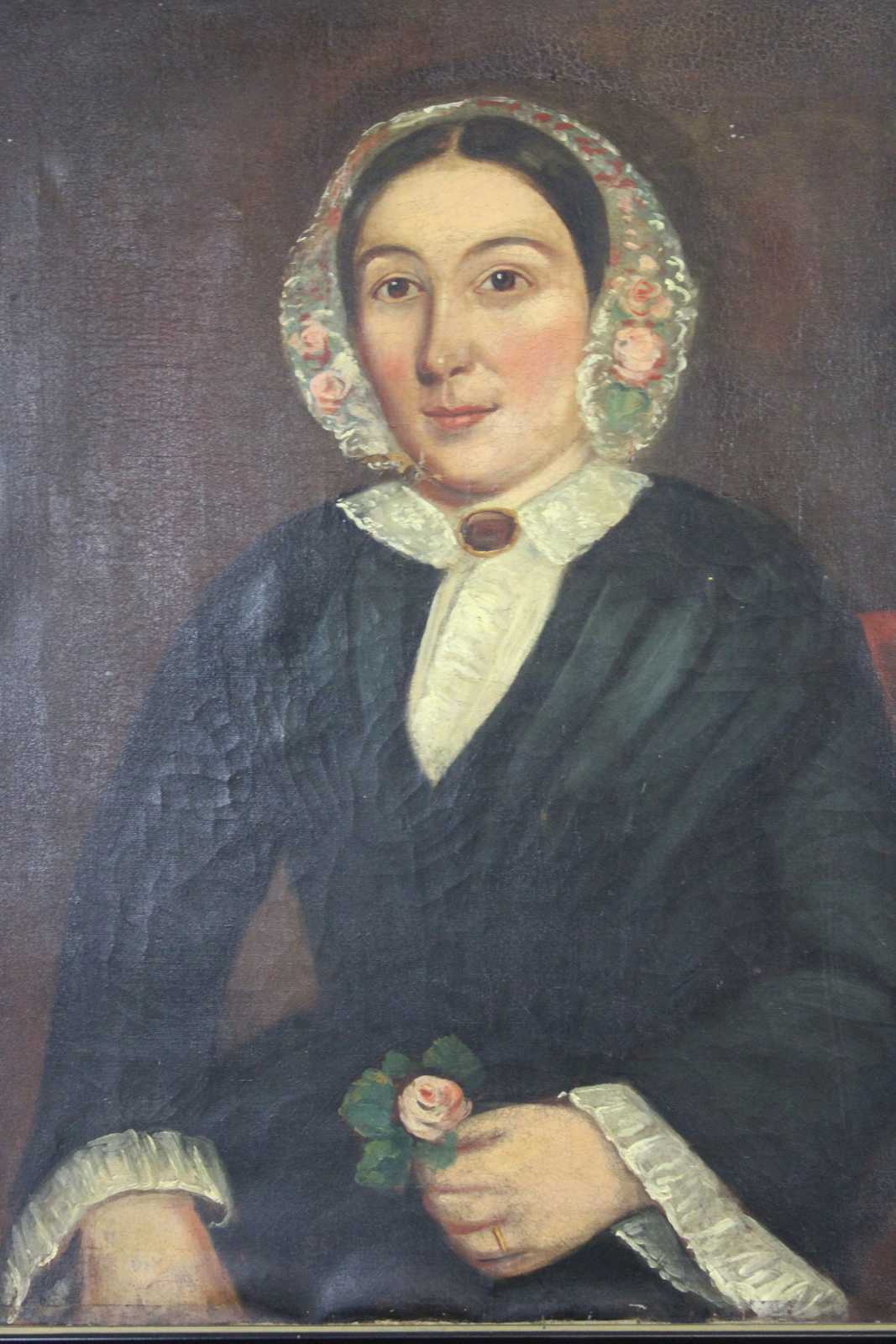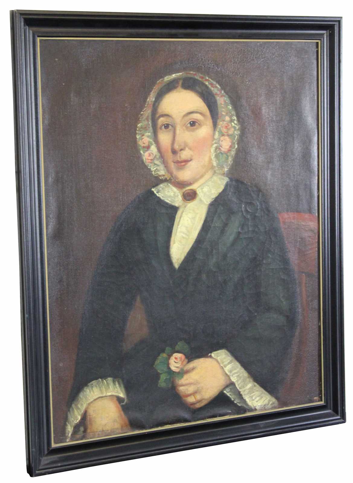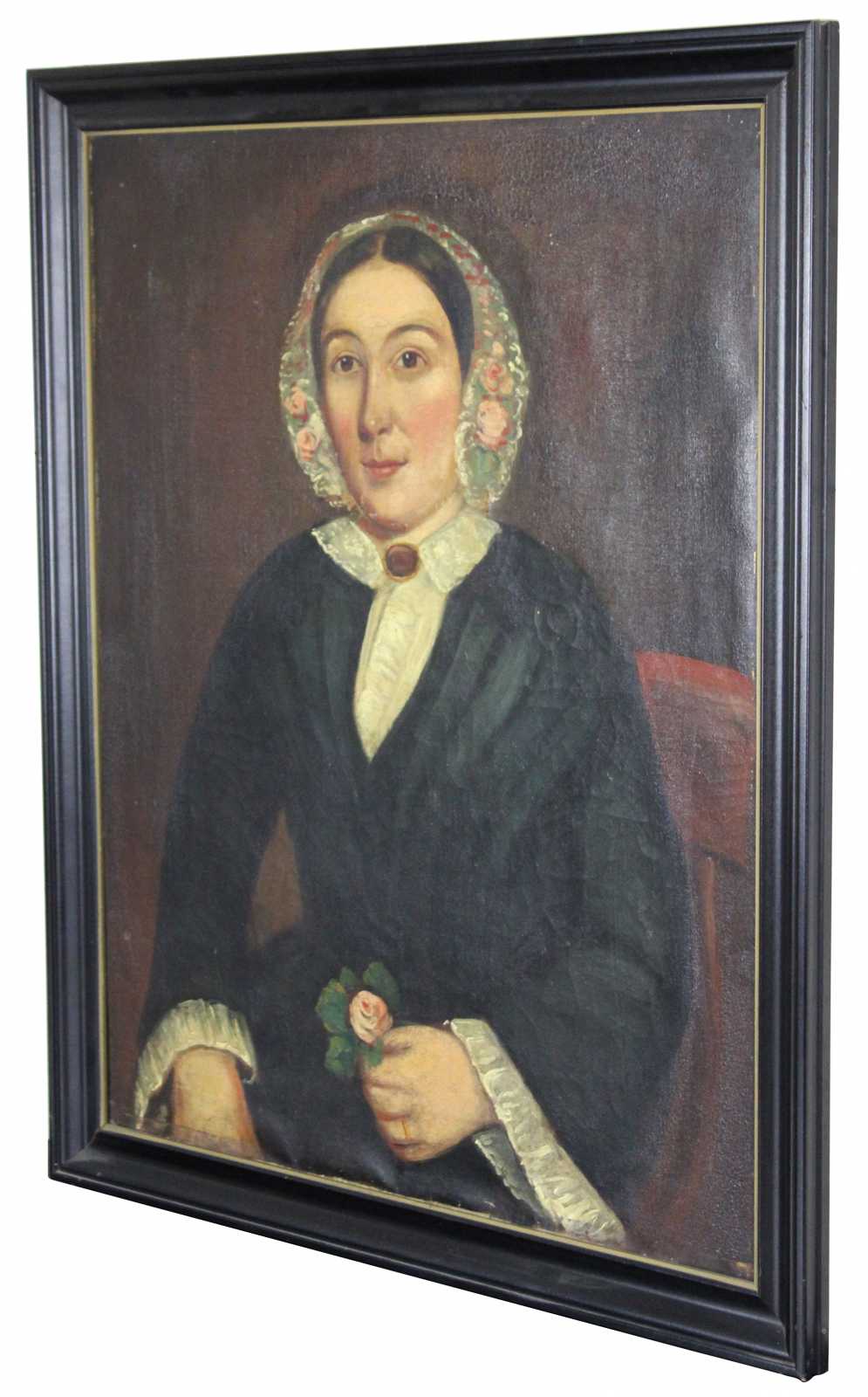 Antique 19th century oil painting of an old woman by Henry Jame Barrett. Features a lady wearing a bonnet in traditional attire holding a rose.