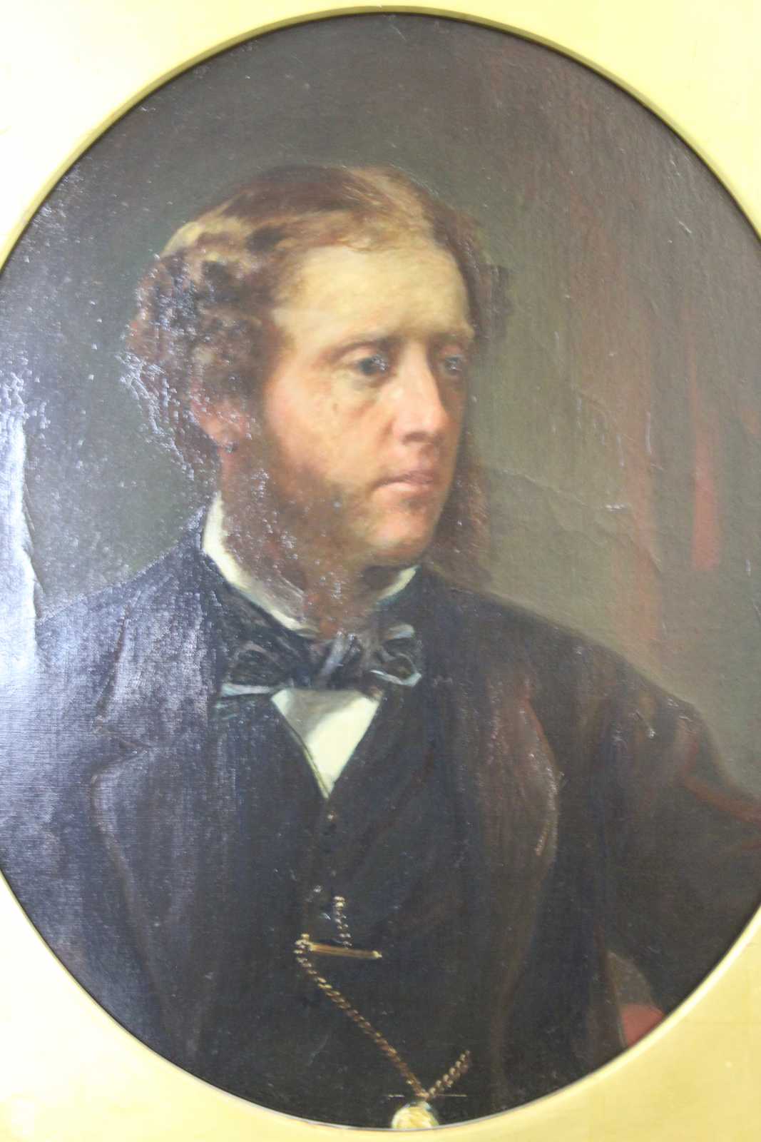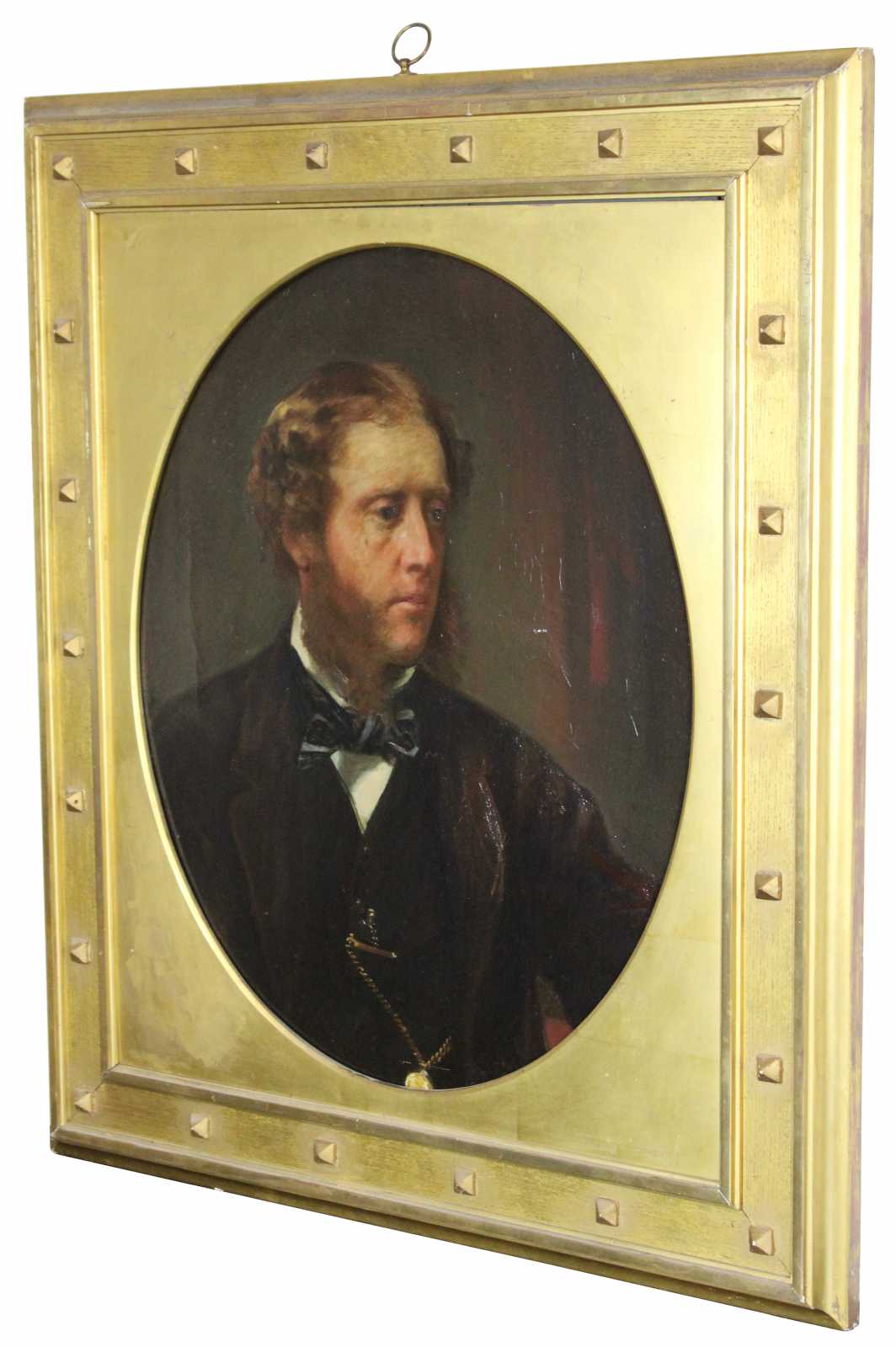 Antique 19th Century portrait oil painting prepared by Winsor Newton. Features a young man dressed in traditional attire with big sideburns, a bowtie and pocket watch. Finished with a gothic inspired gold gilt oval encased frame with rivets.