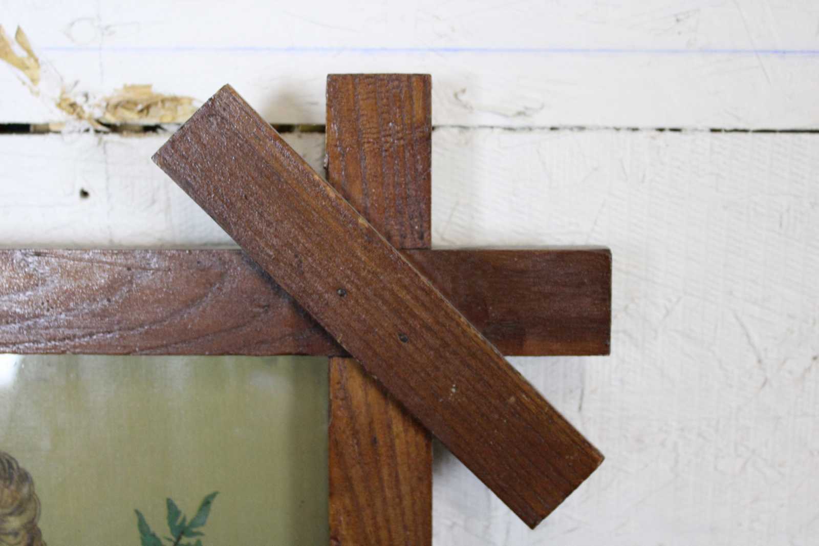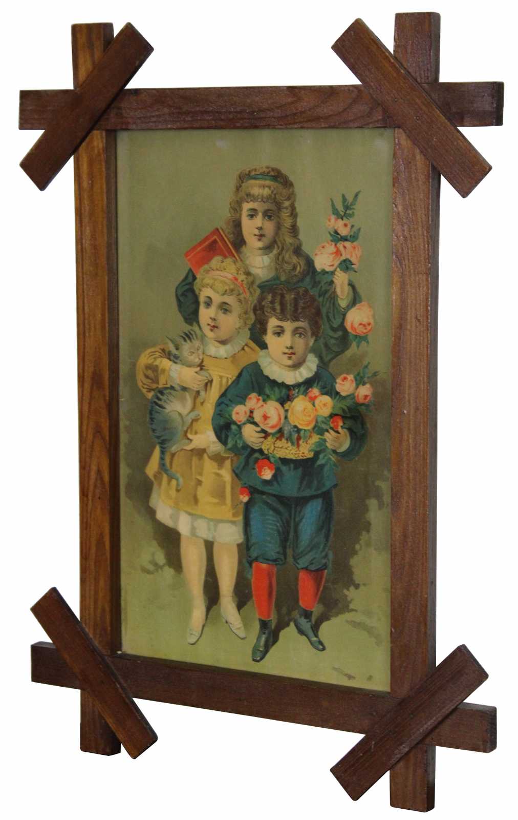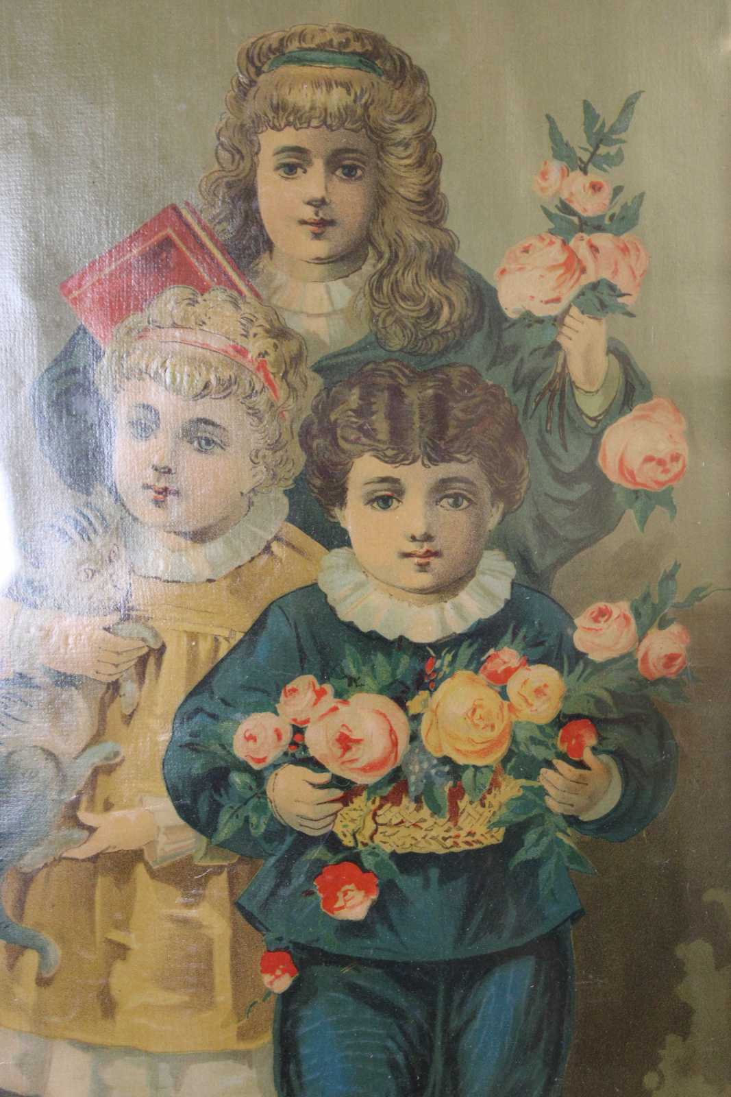 1881 antique Victorian chromolithograph print - embossed chromolithograph in wood frame with glass depicting three young children (boy and two girls) with a cat, flower bouquets and a book. The children are dressed formally, and appear to be greeting people for the holidays.