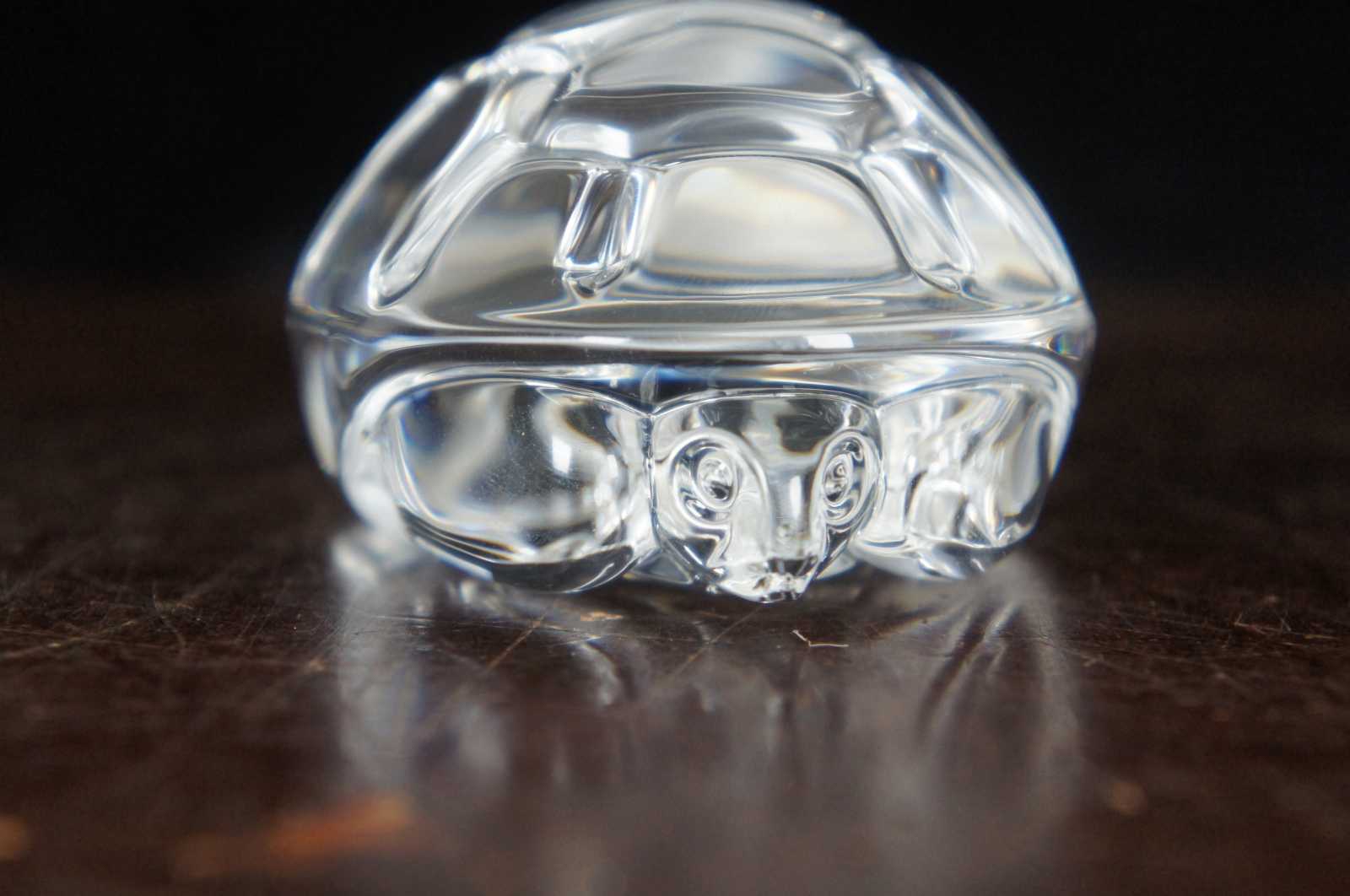 Steuben glass hand cooler in the shape of a turtle tucked into its shell; includes original box.