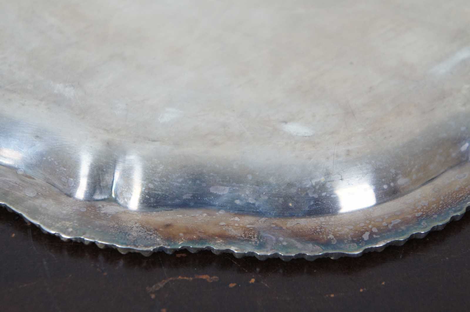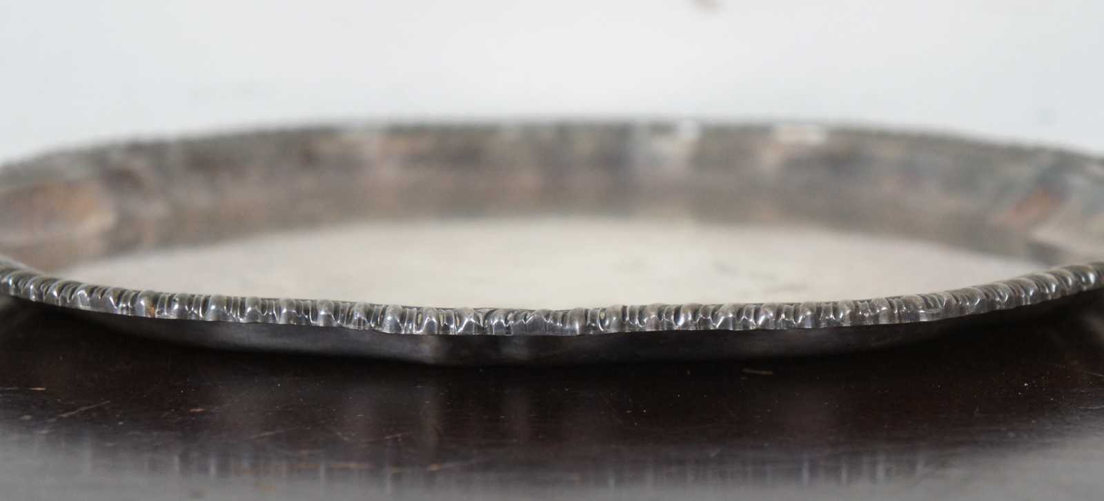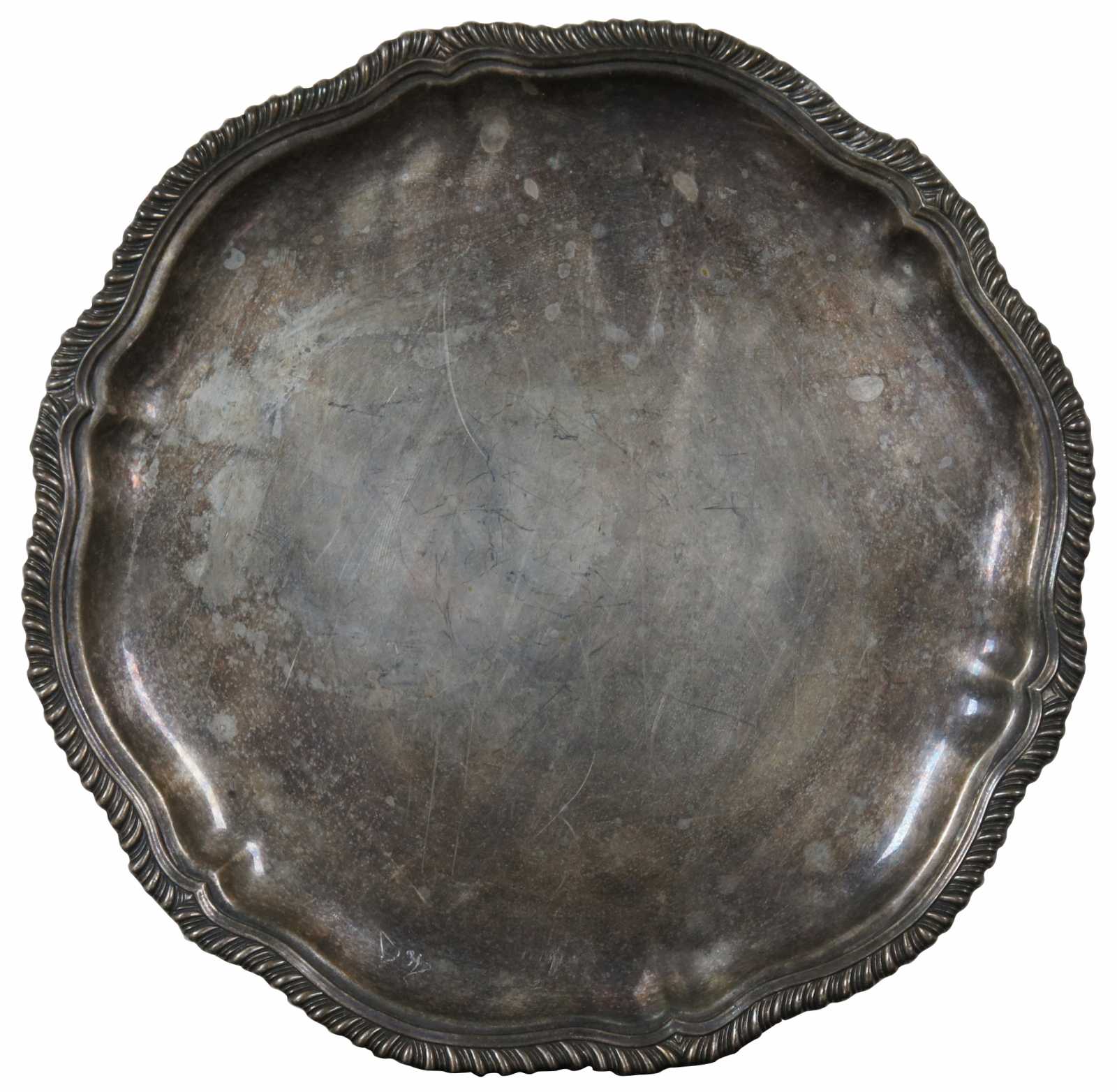 Vintage International Silver Co and Webster Wilcox round silverplate tray in the Staffordshire (England) pattern with scalloped rope twist edge / gadrooning..