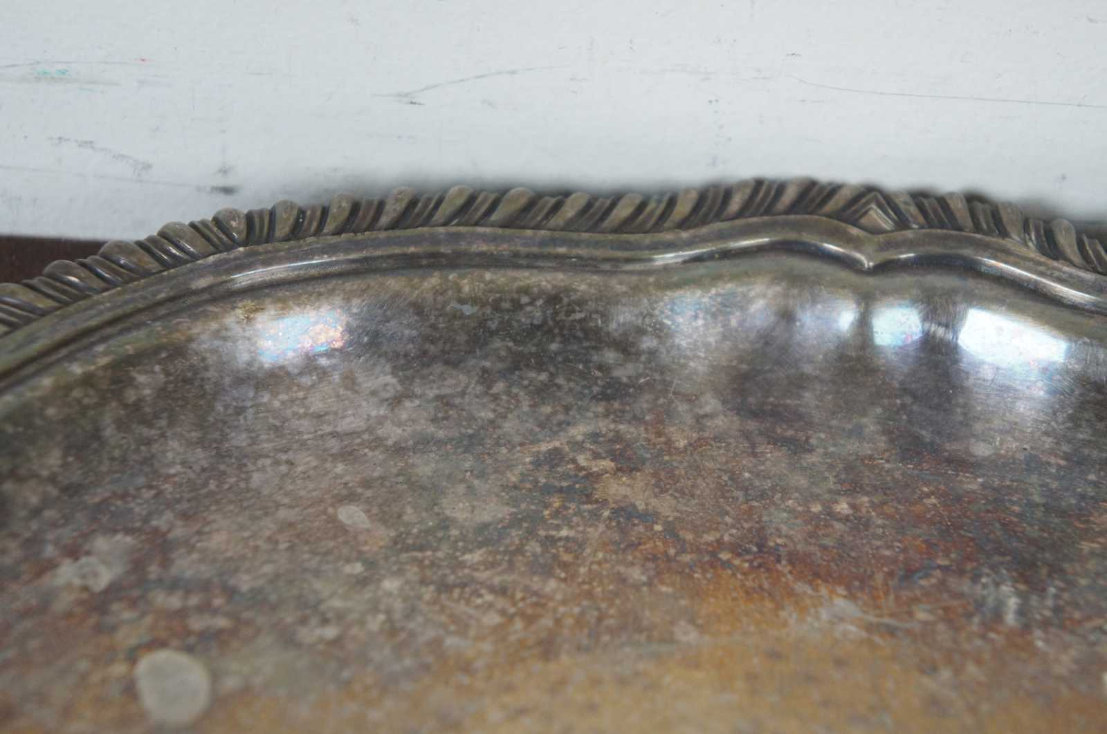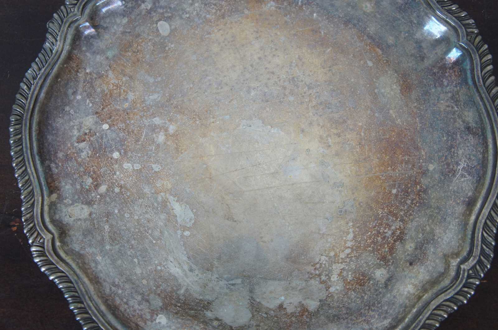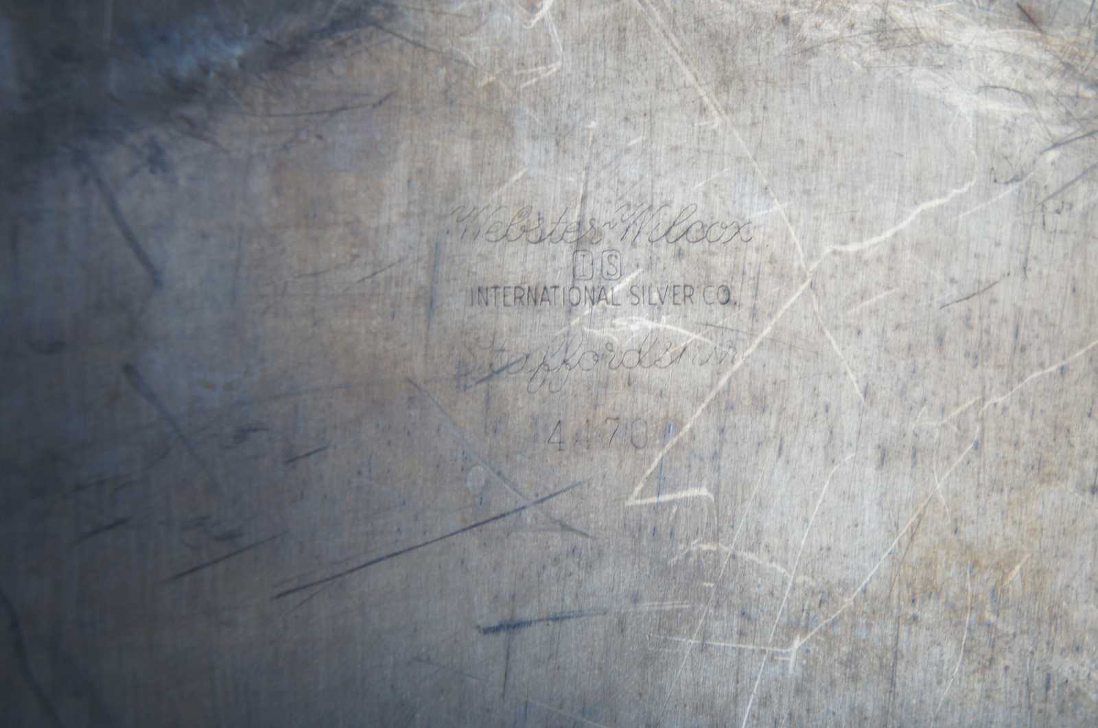 Vintage International Silver Co and Webster Wilcox round silverplate tray in the Staffordshire (England) pattern with scalloped rope twist edge / gadrooning..