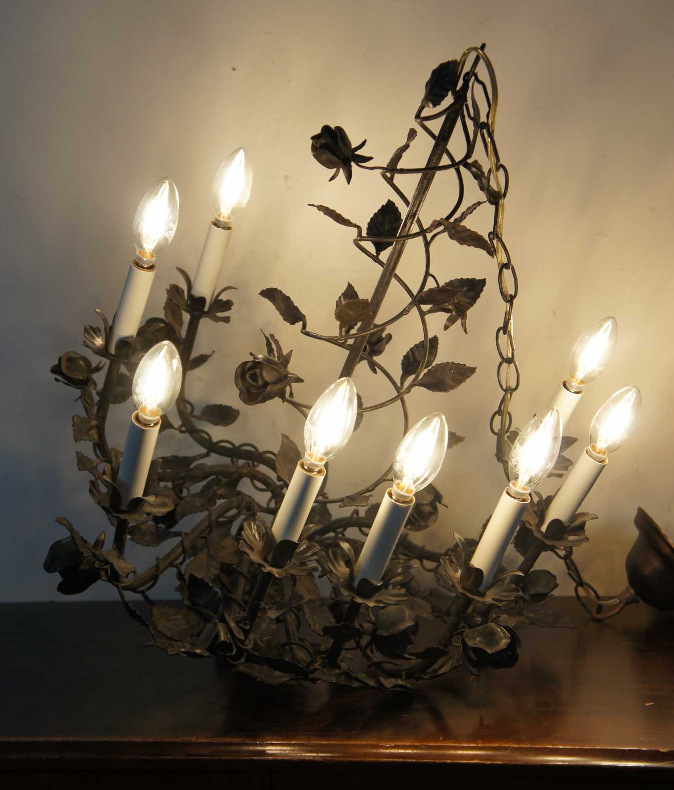 Vintage eight arm wrought iron chandelier featuring roses on a vine with spiral and scrolled design.