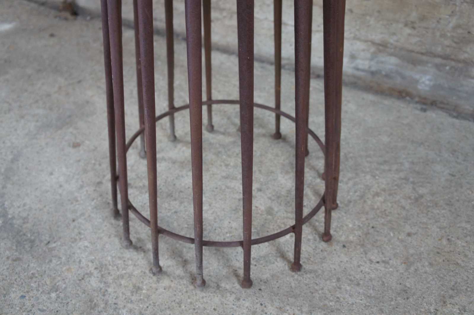European marble top and wrought iron side accent table. Features a circular white marble top that rests within a wrought iron band and sits above sixteen wrought-iron needle form legs also in a circular formation with stretcher.