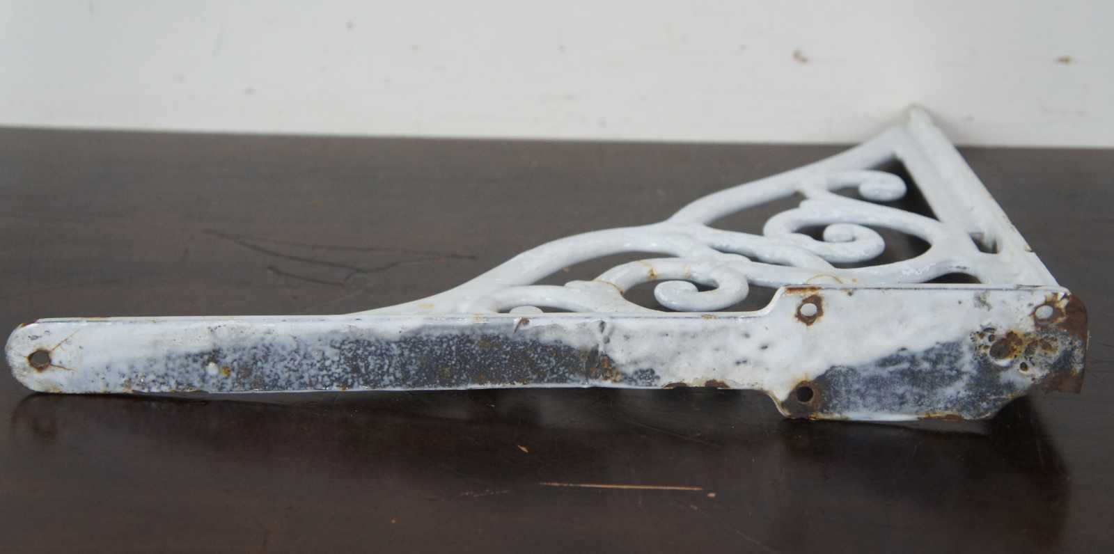 Single antique white enameled cast iron shelf bracket with a lovely scrolled design.