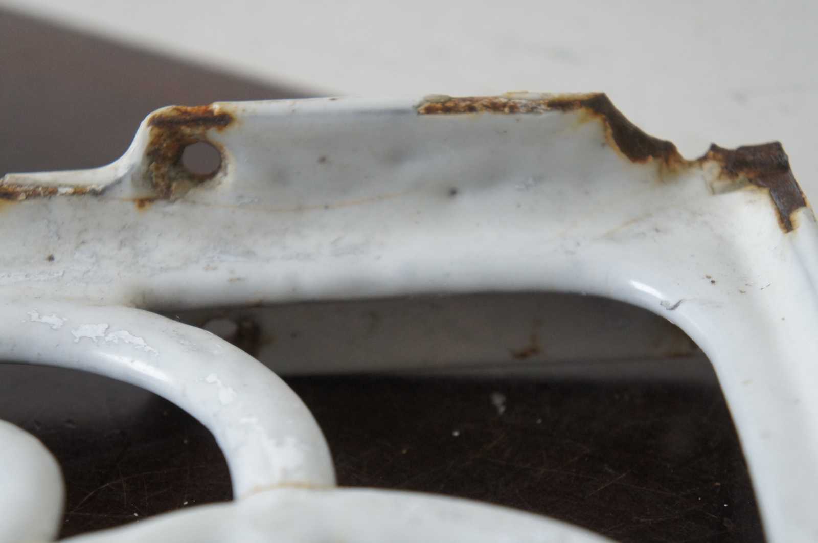 Good Overall - Chips/cracks in enamel; rusted where metal exposed; two corners missing; repainted at some point; see pictures