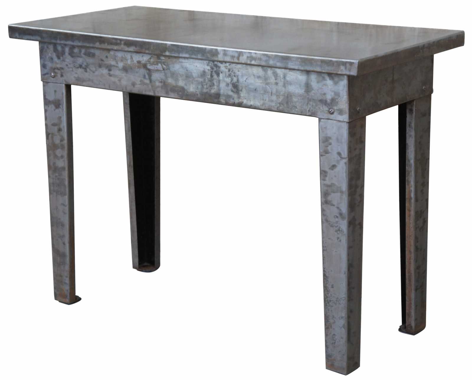 Industrial inspired stainless steel wrapped rectangular form console or sofa table.