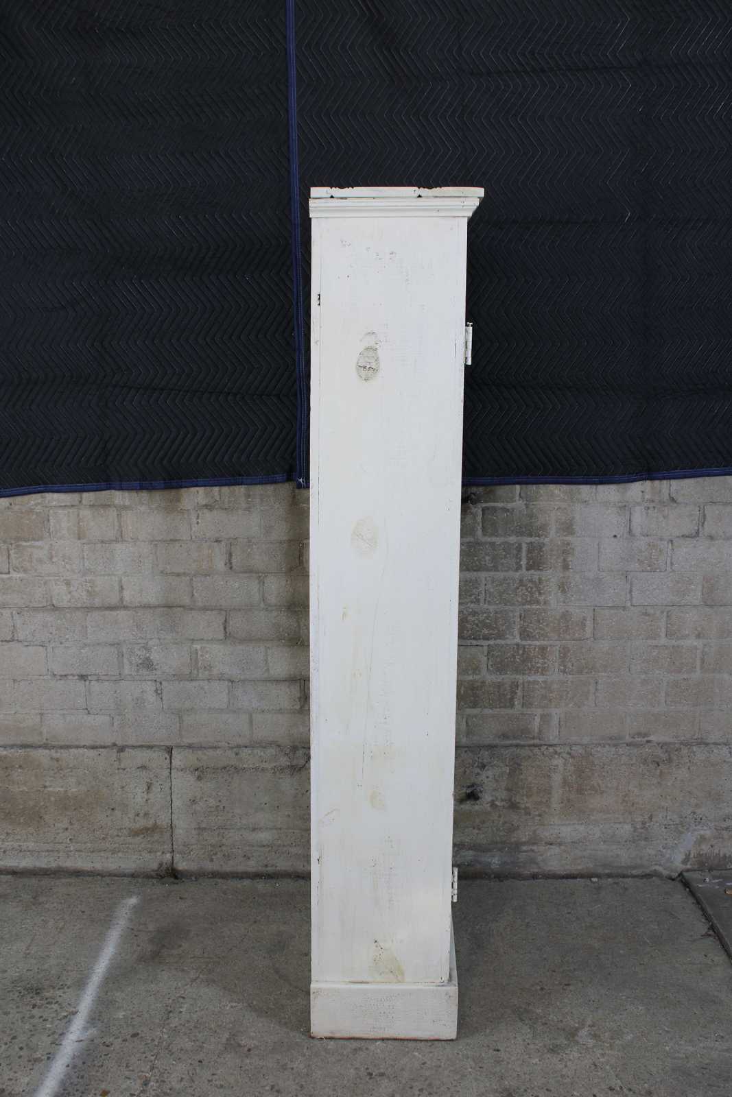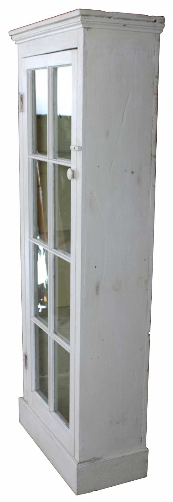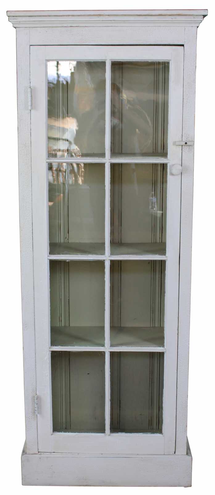 Primitive reclaimed pine country farmhouse cupboard, linen press or cabinet. Features a chic white distressed painted finish and paneled glass doors.