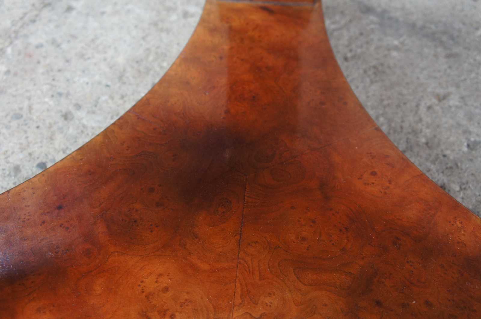 Late 20th century olive burl and scrolled brass side table. Featuers a round top supported by three elegent brass scrolls over a tripod form base. Signed along underside.