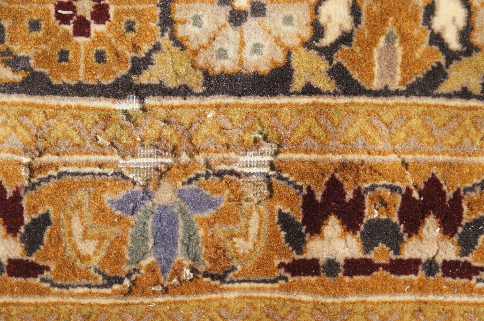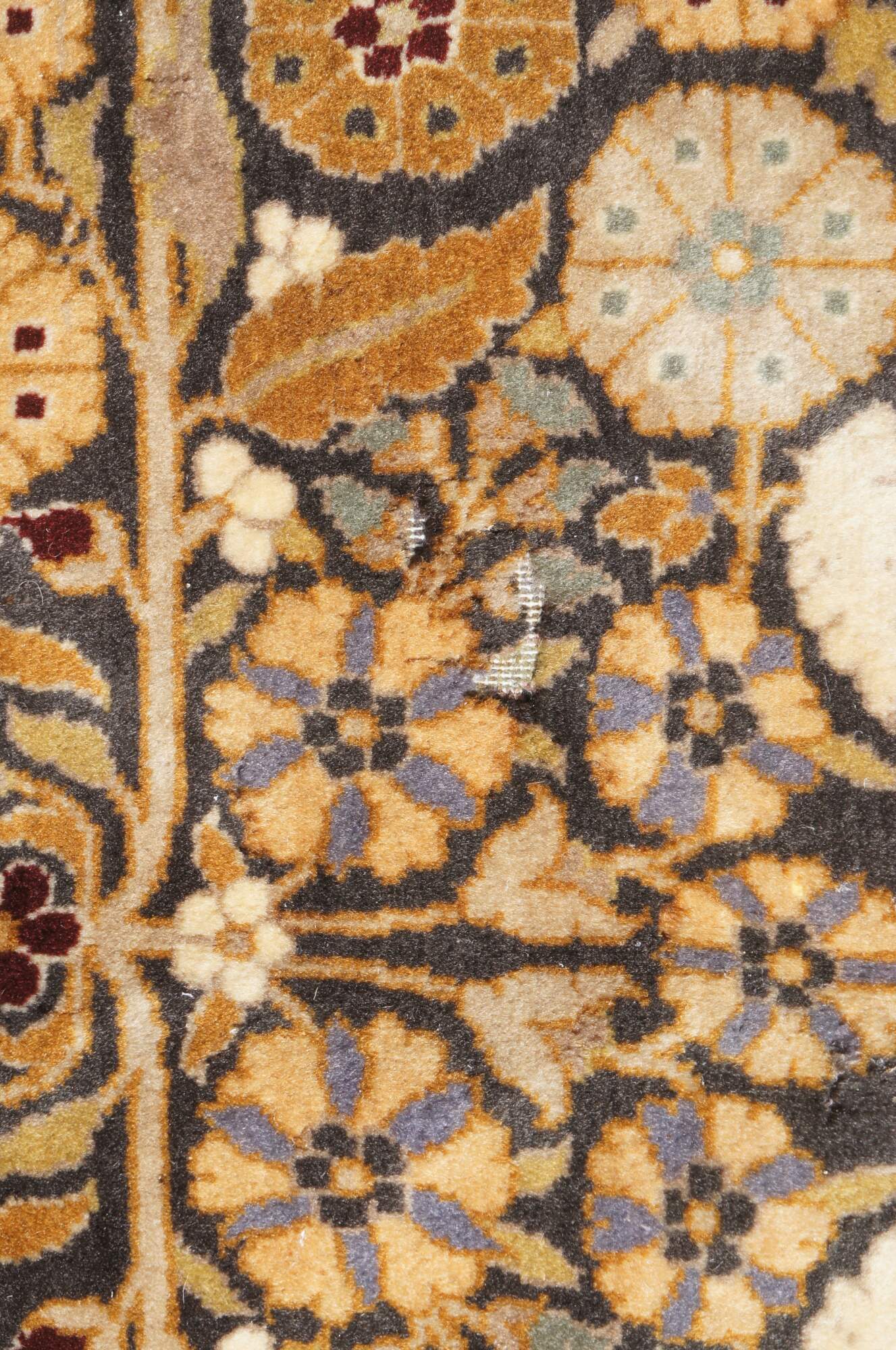 Indian silk and wool rectangular area rug featuring a floral motif throughout a field of gray with beige / tan , reds, blues, gold and green.