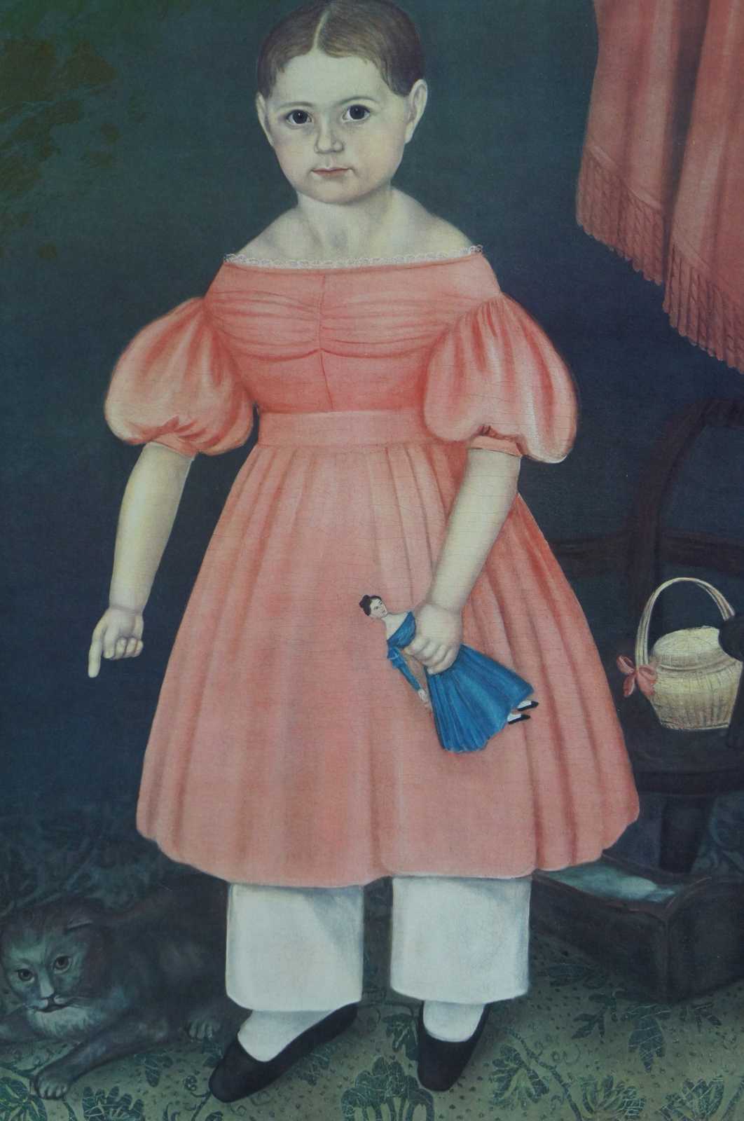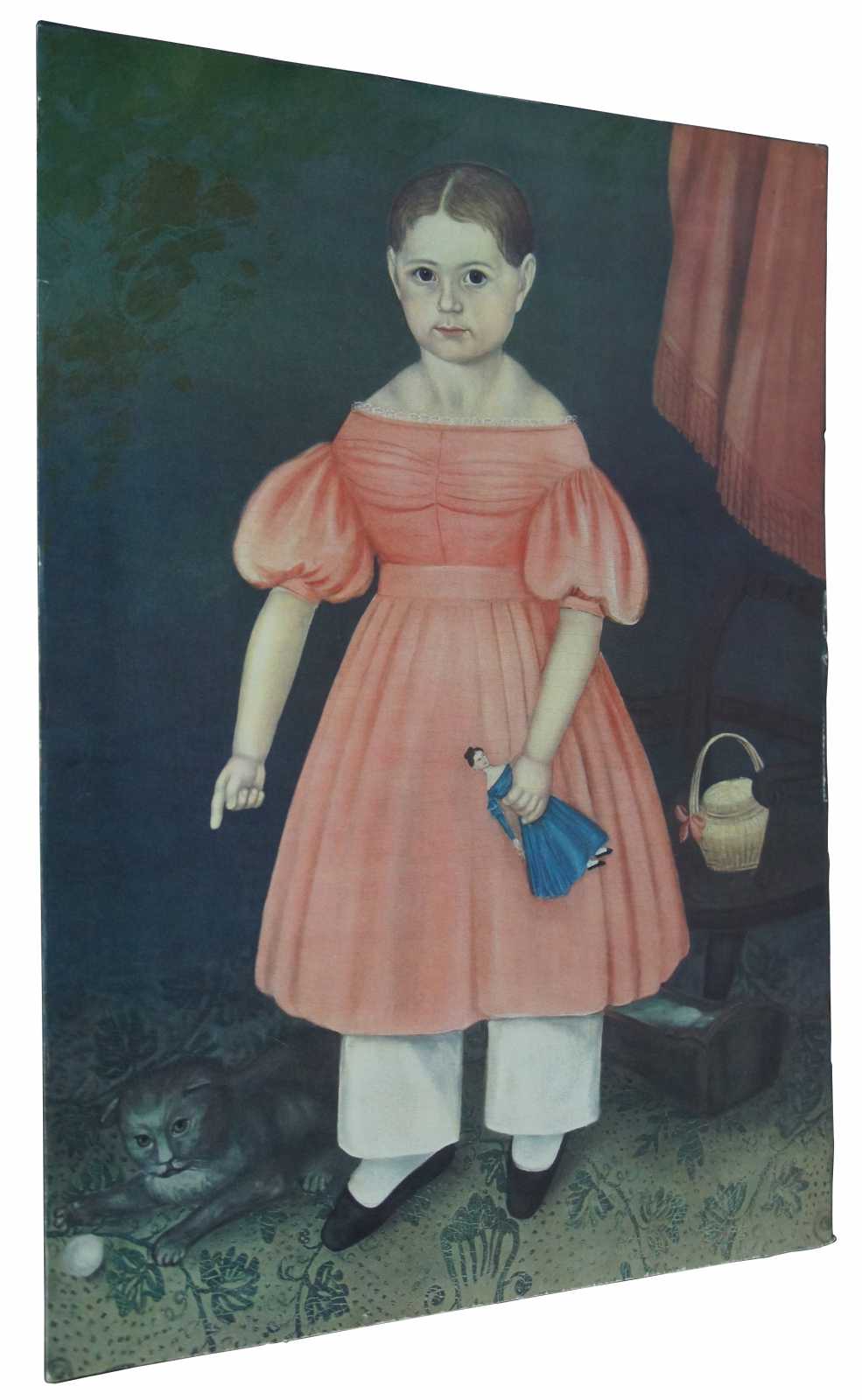 Vintage lithograph print of a mid to late 19th century portrait of a young child in a pink dress, holding a doll and pointing at a gray cat. Print mounted on wood.