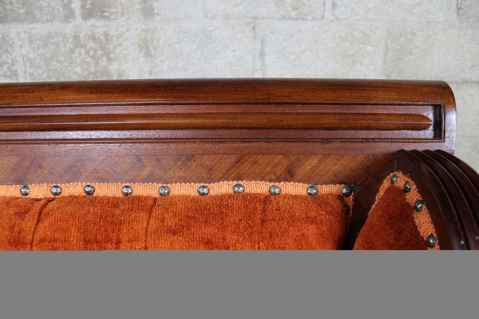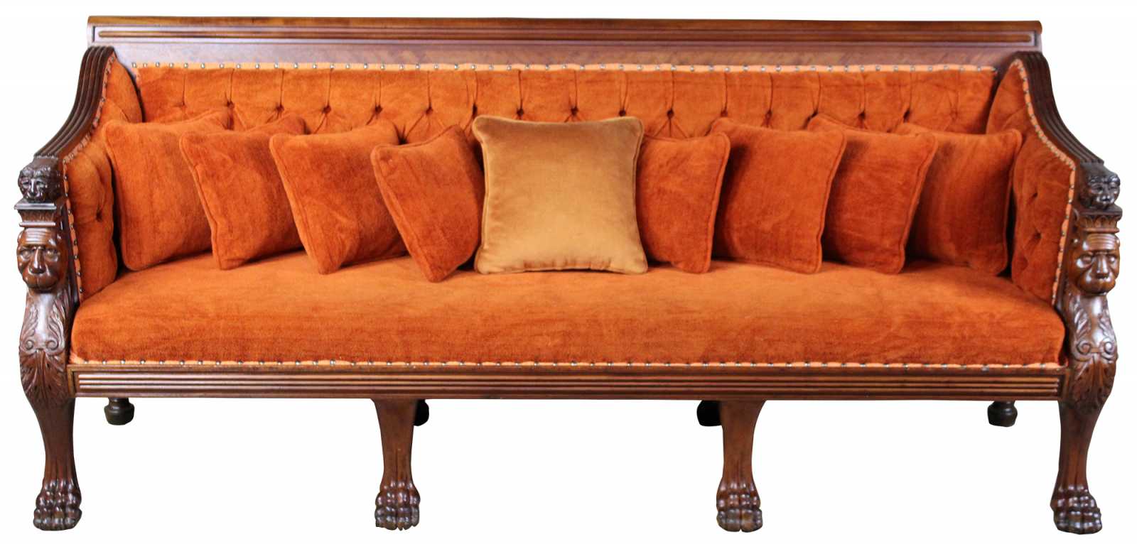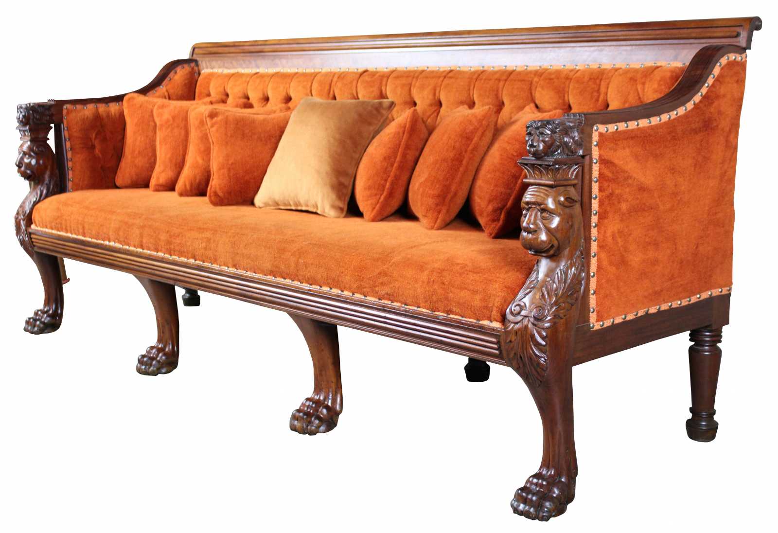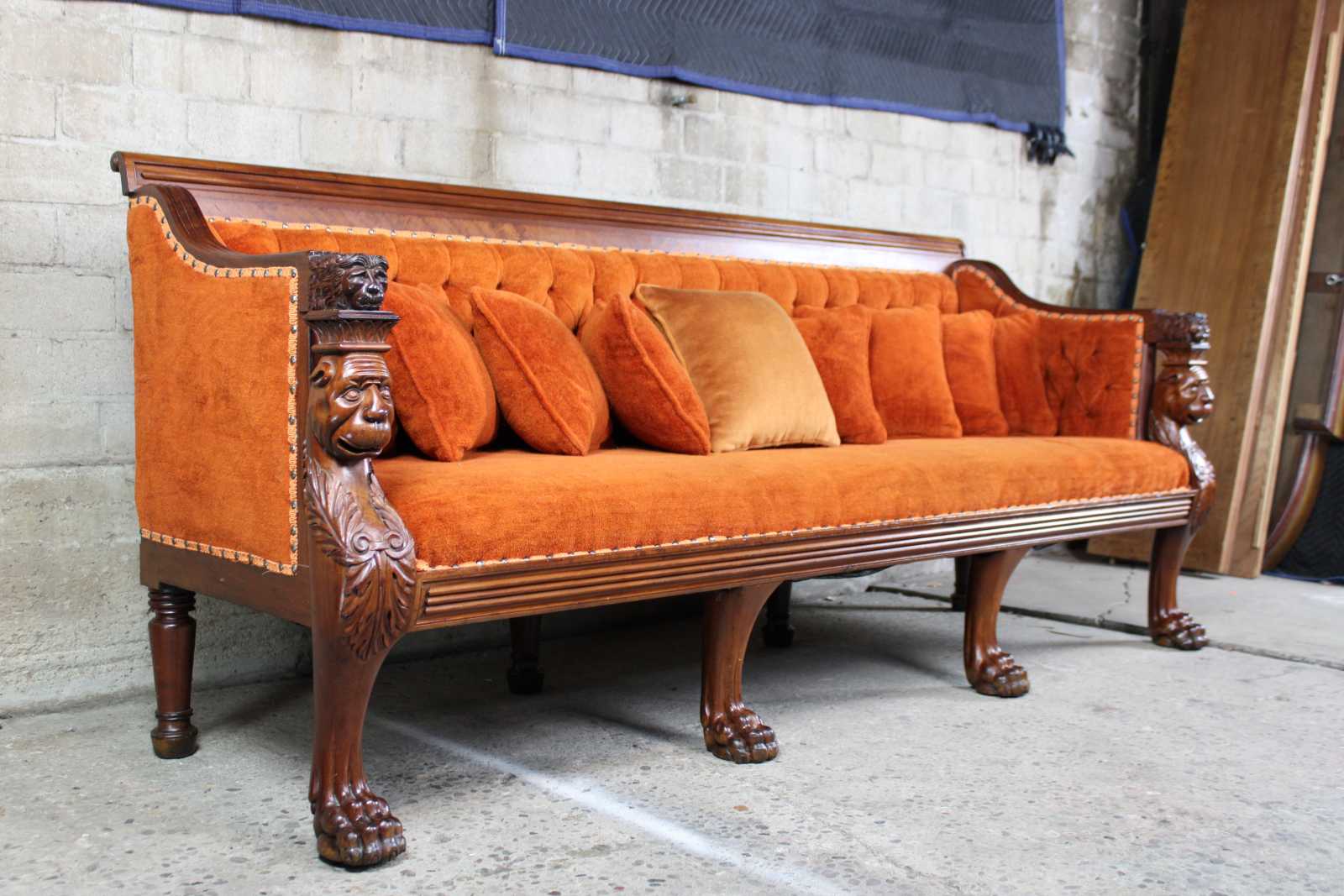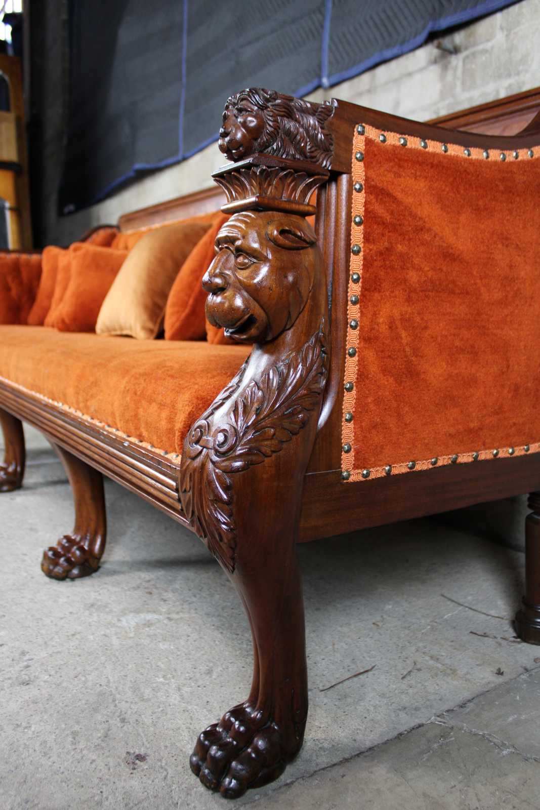 A monumental late Victorian library sofa. Made from Mahogany with figural carved lion heads over intricate paw feet. Upholstered and tufted in orange with brass nailhead trim. Features a scrolled back railing leading to sloped and reeded arms, a finished back, acanthus accents and turned supports.