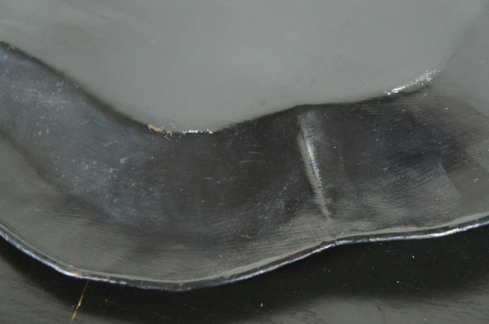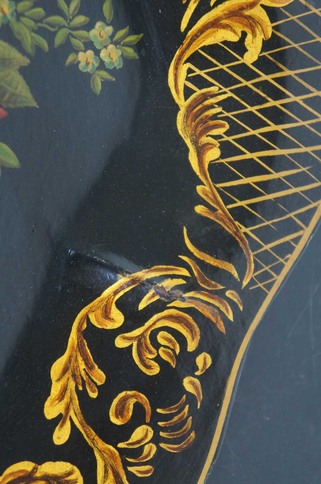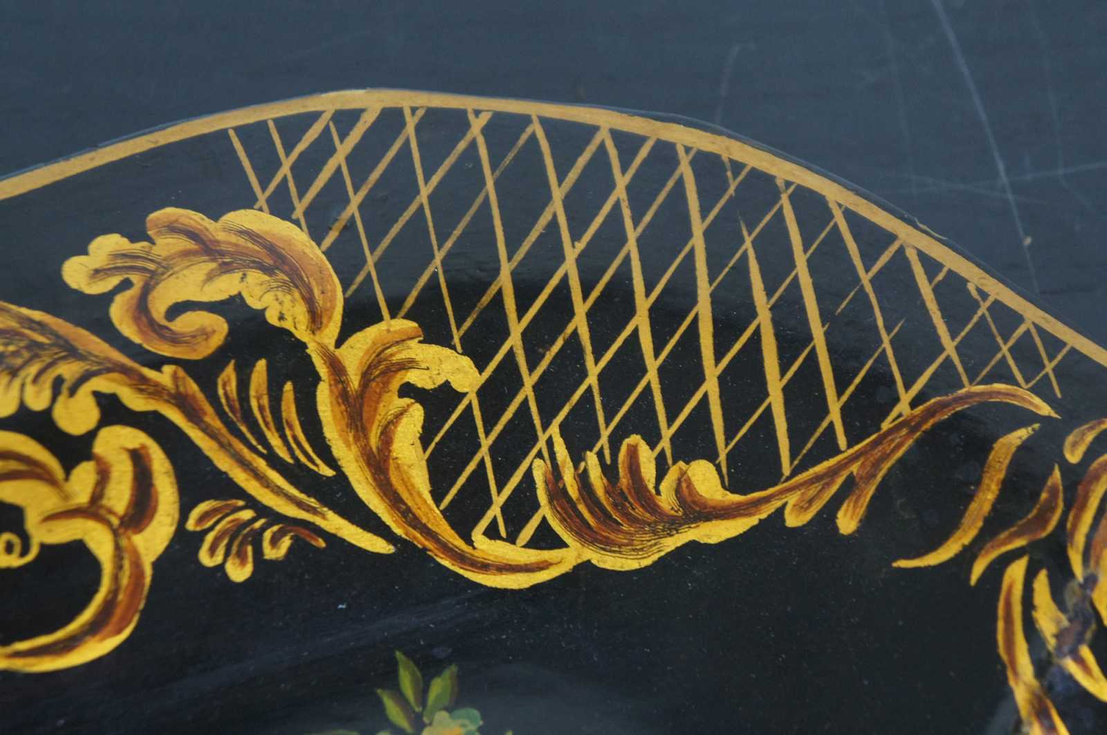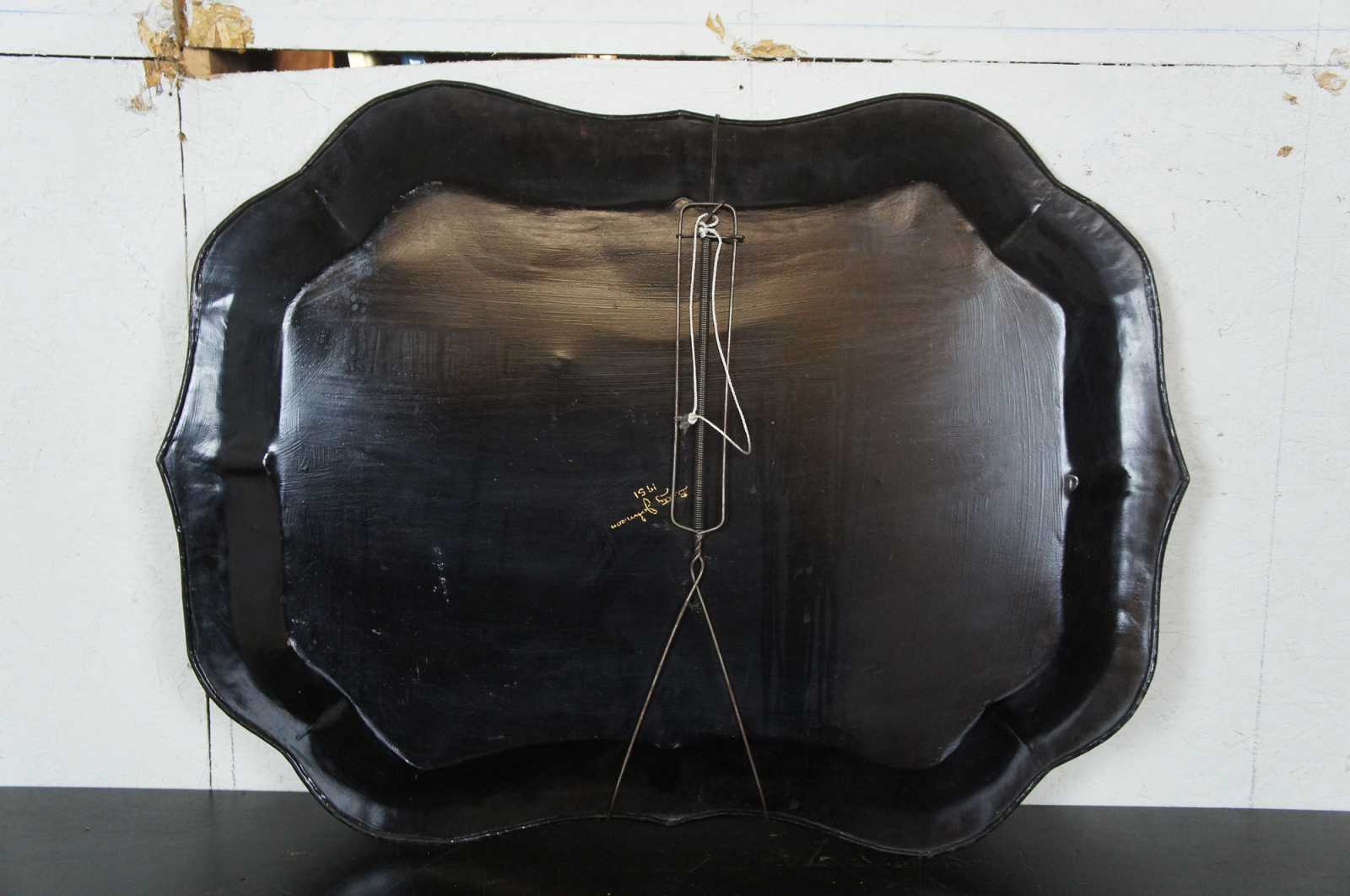 Vintage 1951 mid century scalloped Americana folk art toleware tray featuring a gold leaf border, an array of flowers, and a bird (Peacock) with long tail feathers perched on a fountain. Signed on backside, Betty Johnson. Attributed to Wingcraft.