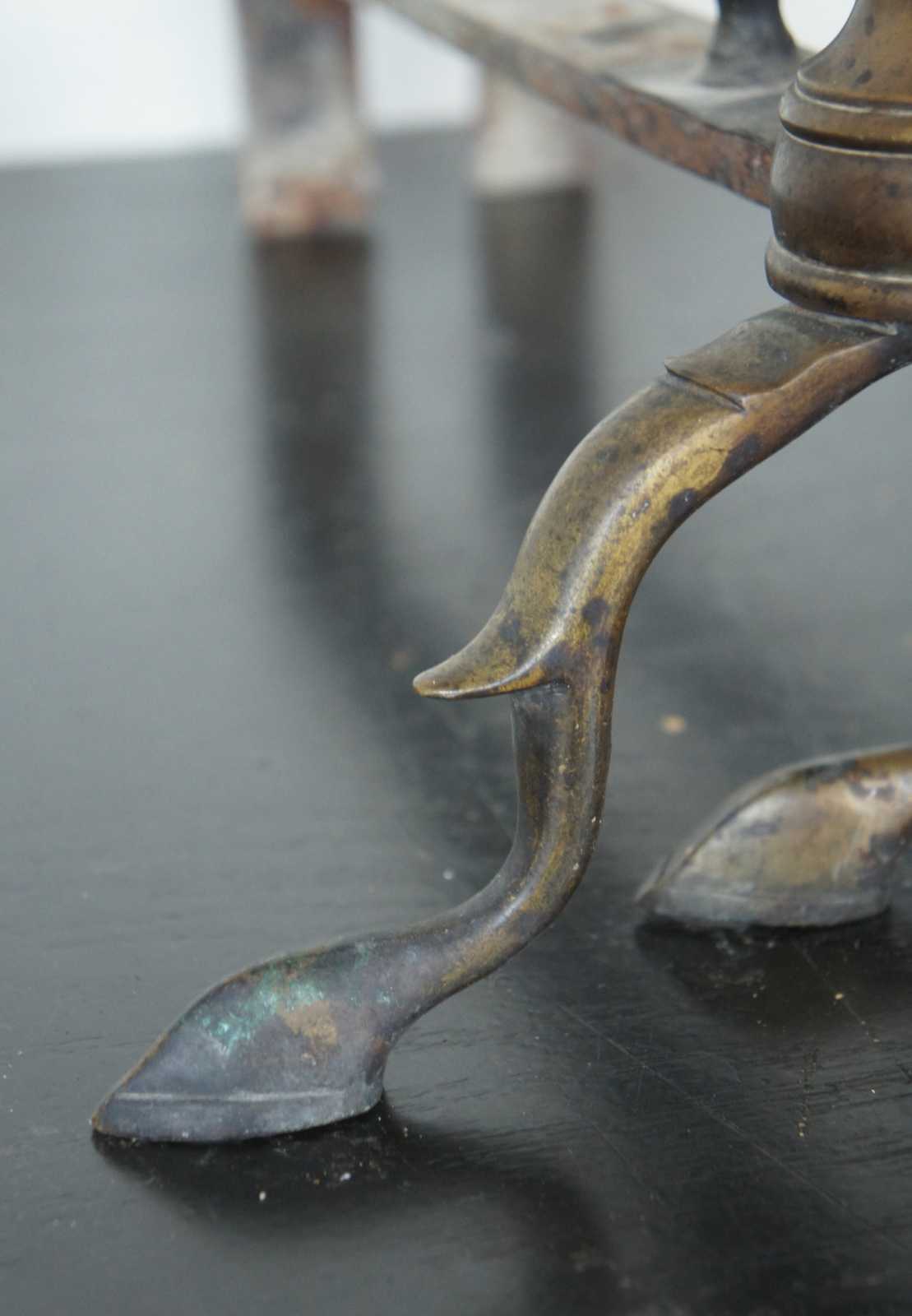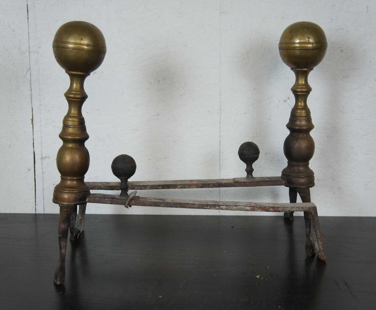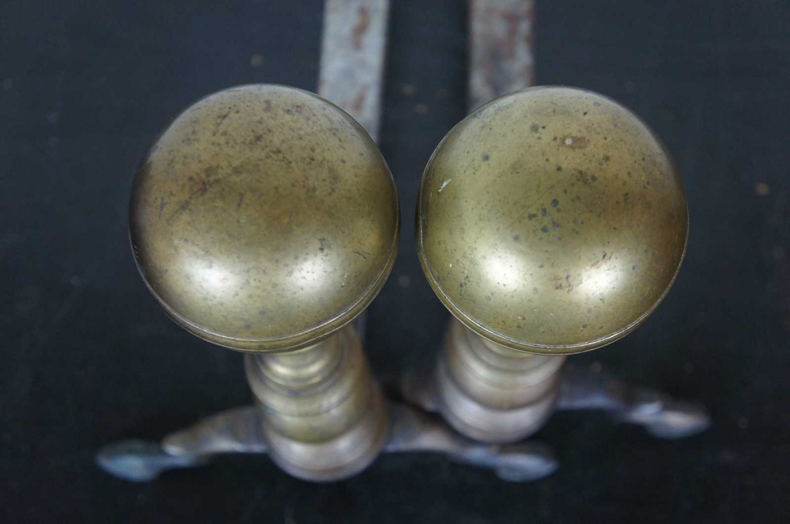 Antique Victorian cast iron and brass cannon ball fireplace andirons or log holders with ball top and hoof shaped feet.