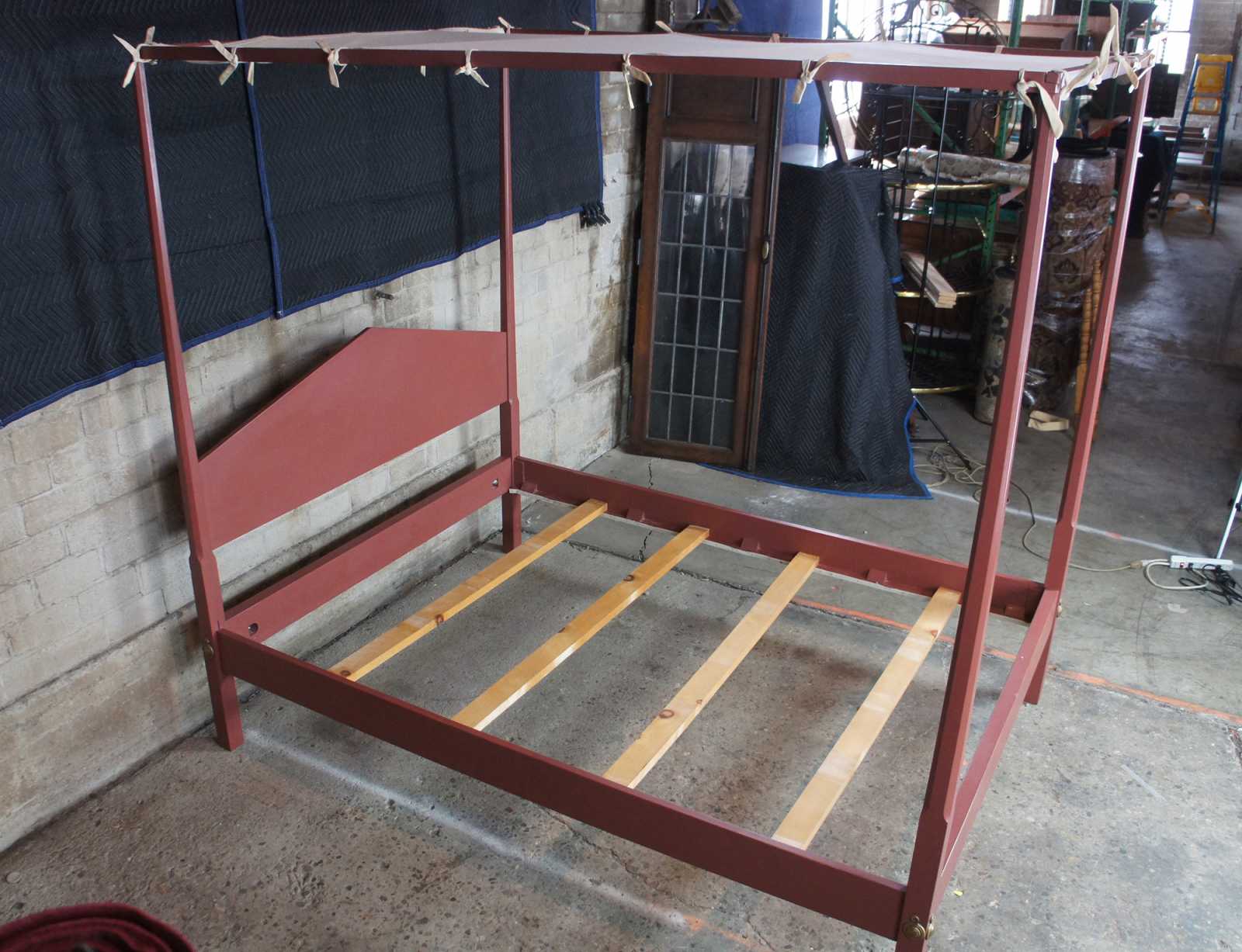 Early American painted pine full size pencil post canopy bed by David T Smith, Circa 1987. A style popularized in the late 1700s. Features a canopy with fabric, pencil posts and colonial hardware. Finished in Old Red.