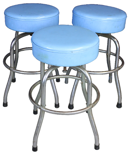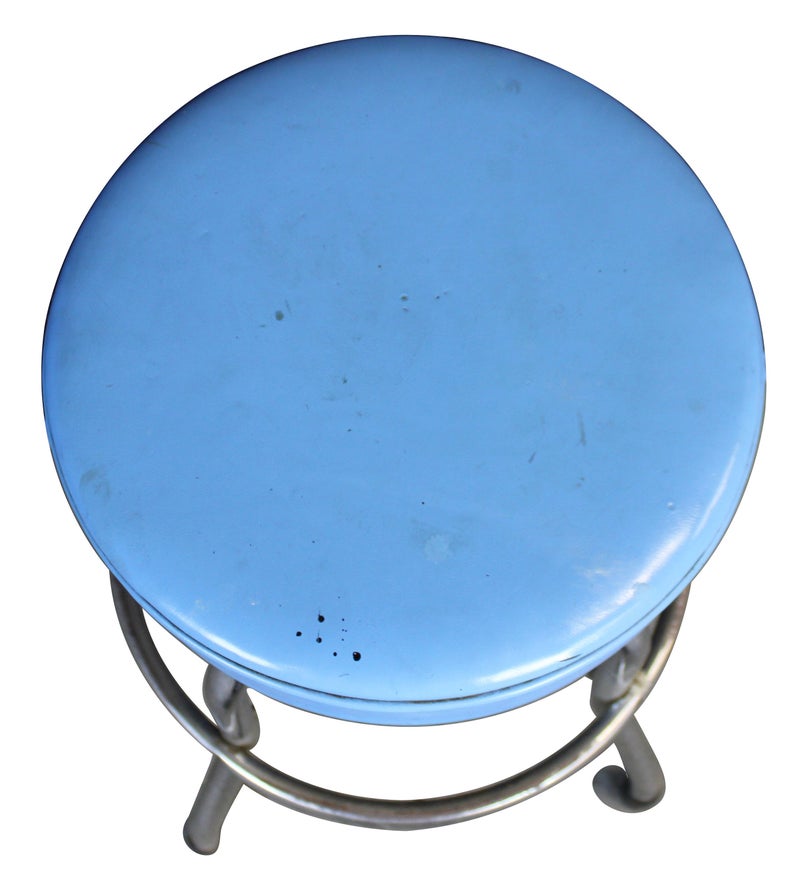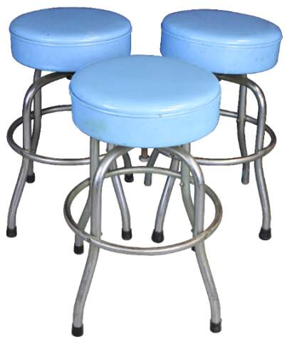 Three vintage leather and chrome industrial stools. These came from vintage custom display case set up in an old retro apothecary store in Pennsylvania.