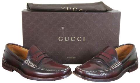 Gucci polished leather Camaleon men’s slip on loafer in chardonnay brown, product number 368442.