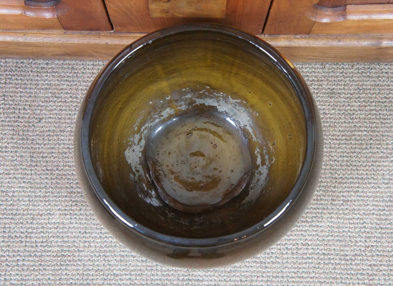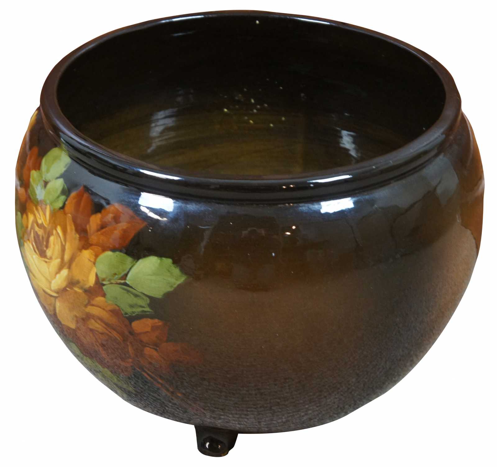 Vintage brown and green ceramic planter painted with yellow roses, by McCoy pottery and marked Loy-Nel-Art.