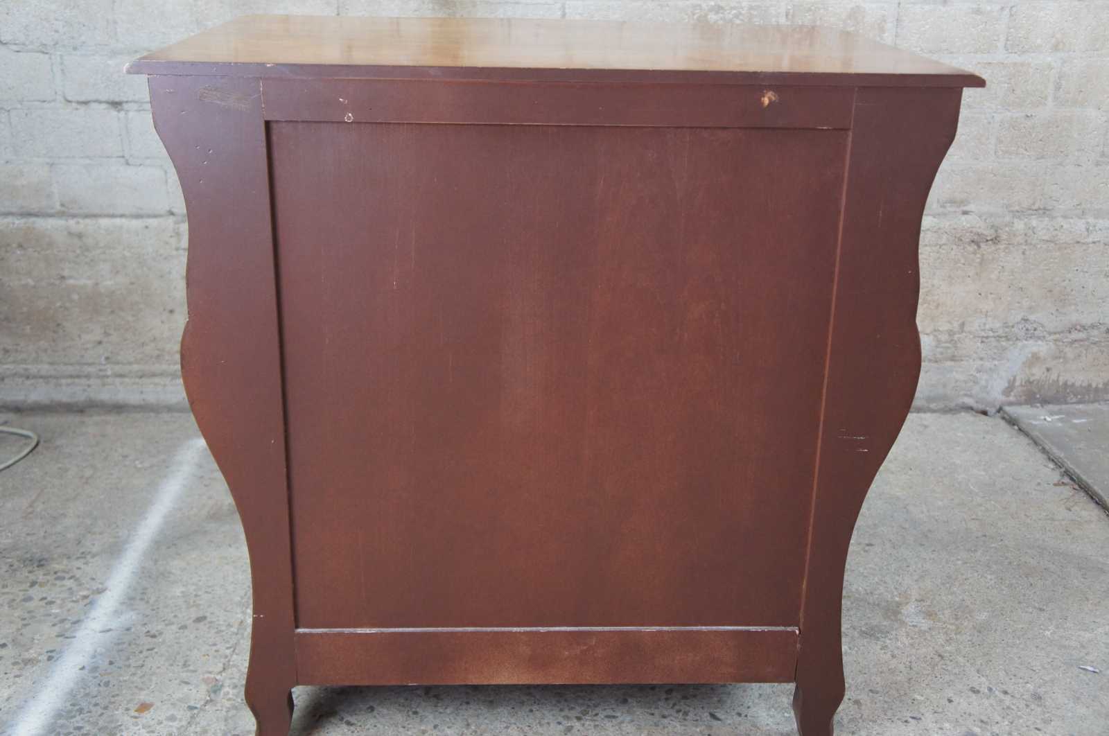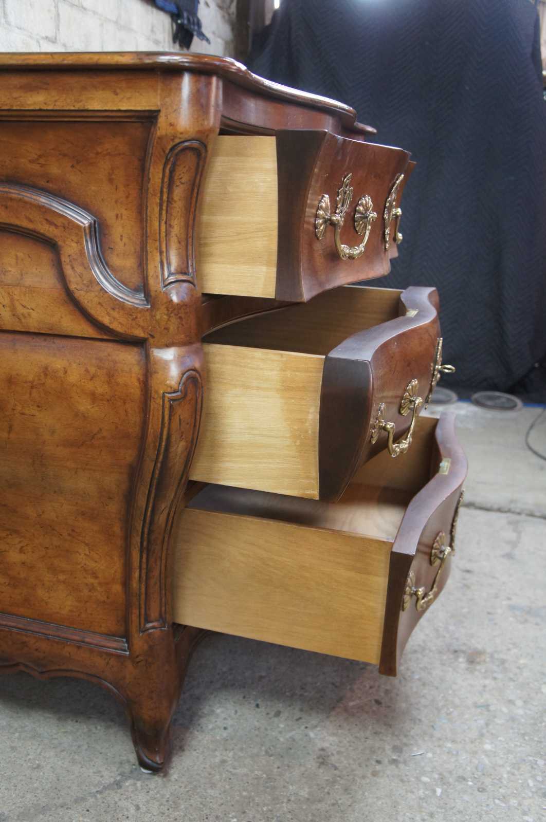 Baker Furniture McMillan Collection Bombe Chest. Inspired by classic Louis XV & French Provincial styling, Naturally distressed shaped walnut with a serpentine top. Features four drawers with brass mounts and faux keyholes, cabriole legs and a lower scalloped apron.