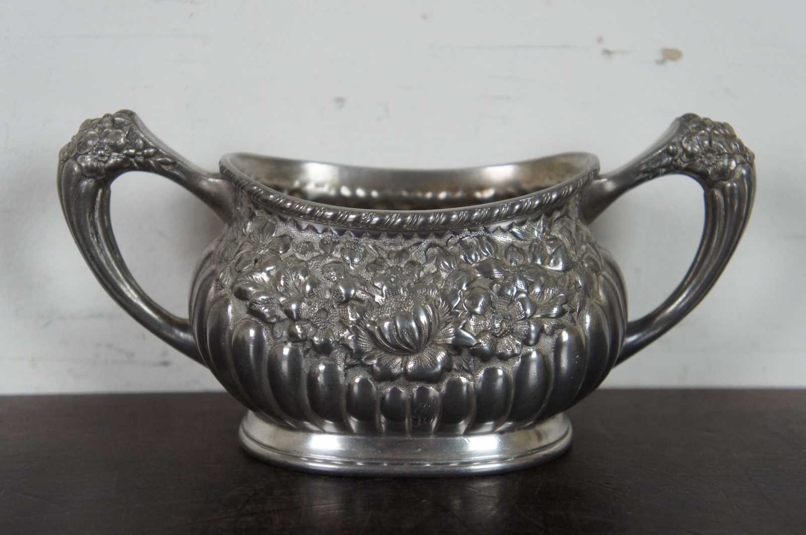 Five piece tea and coffee quadruple plate serving set by American Silver Plate Co, 3014, with a high relief repousse floral design. Made during the Aesthetic movement towards the last part of the Victorian era.