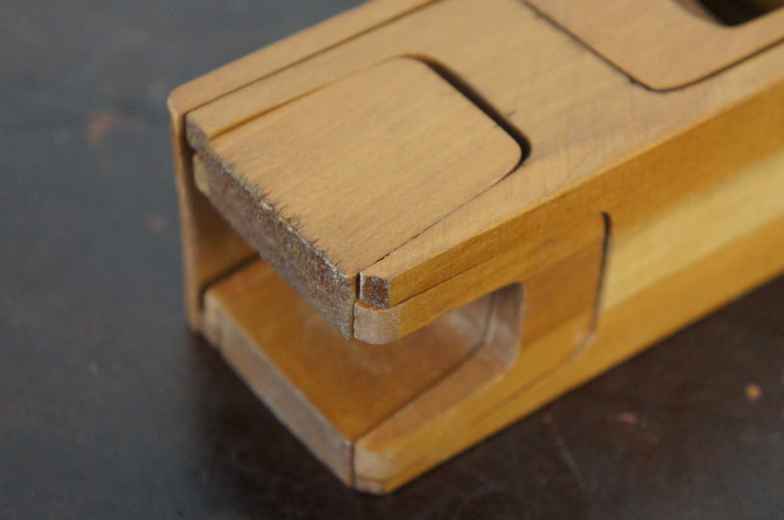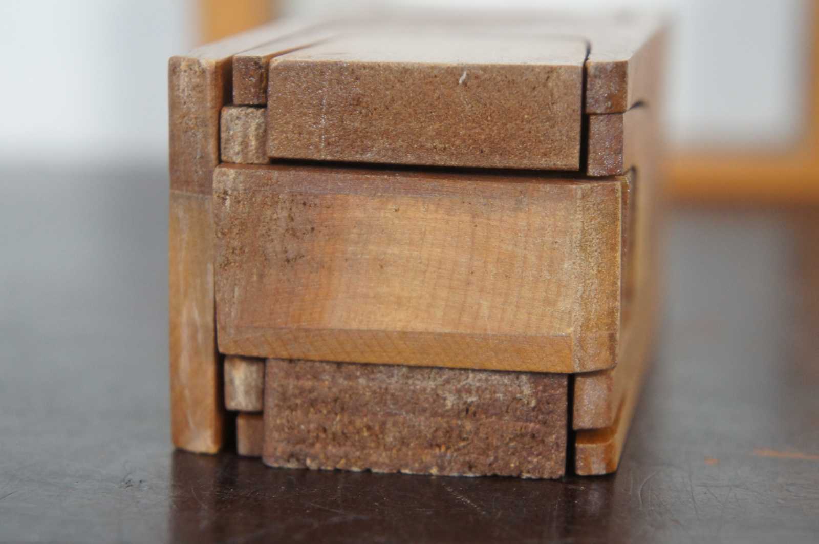 Vintage Allied Van Lines moving truck box containing a wooden furniture puzzle that combines to a compact, van sized cube.