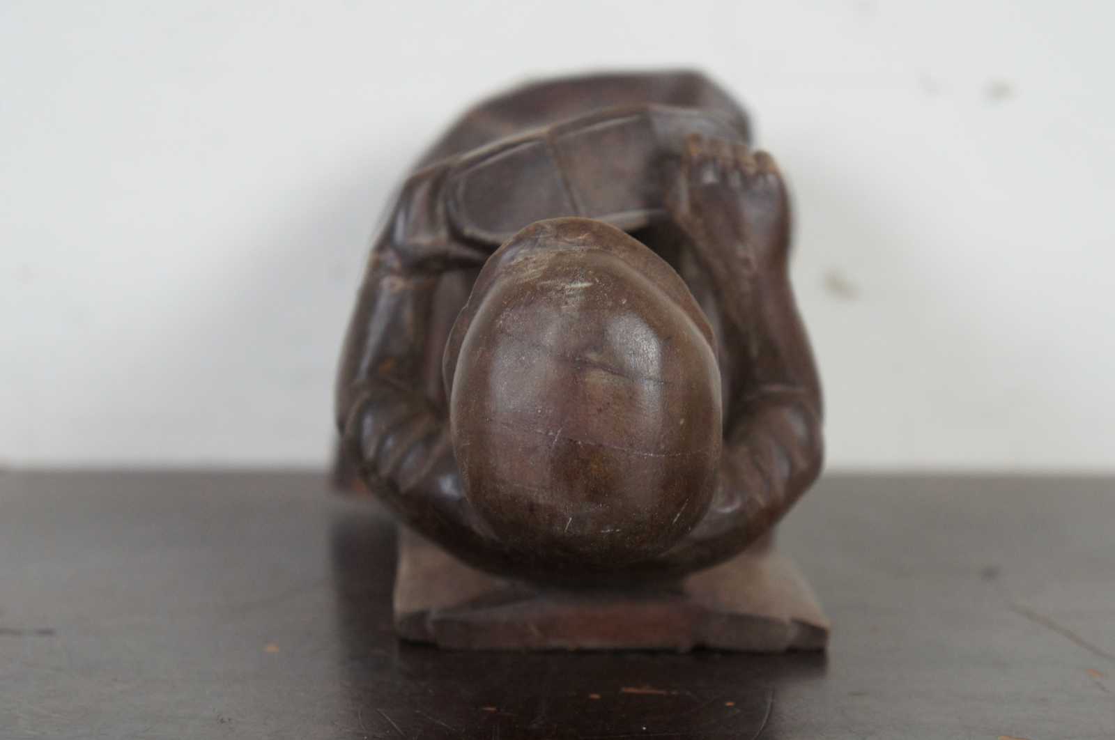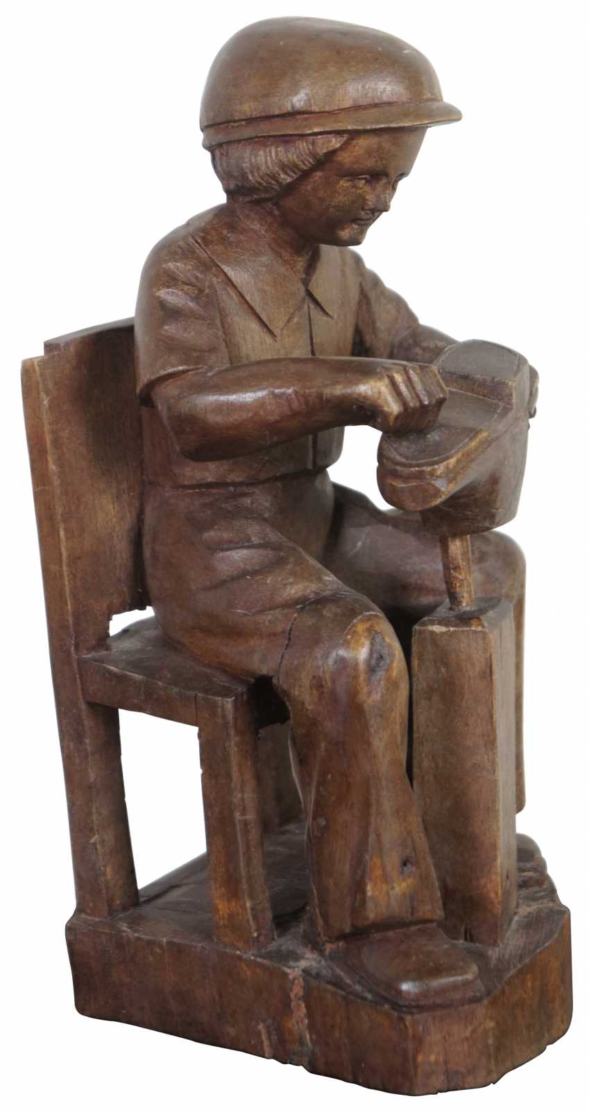 Vintage hand carved folk art figurine of a cobbler making a shoe.