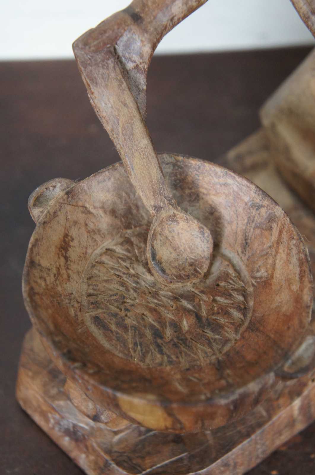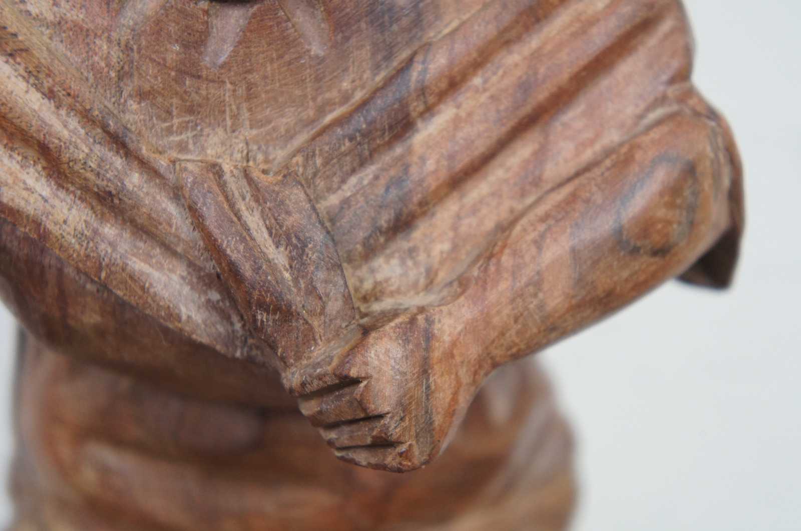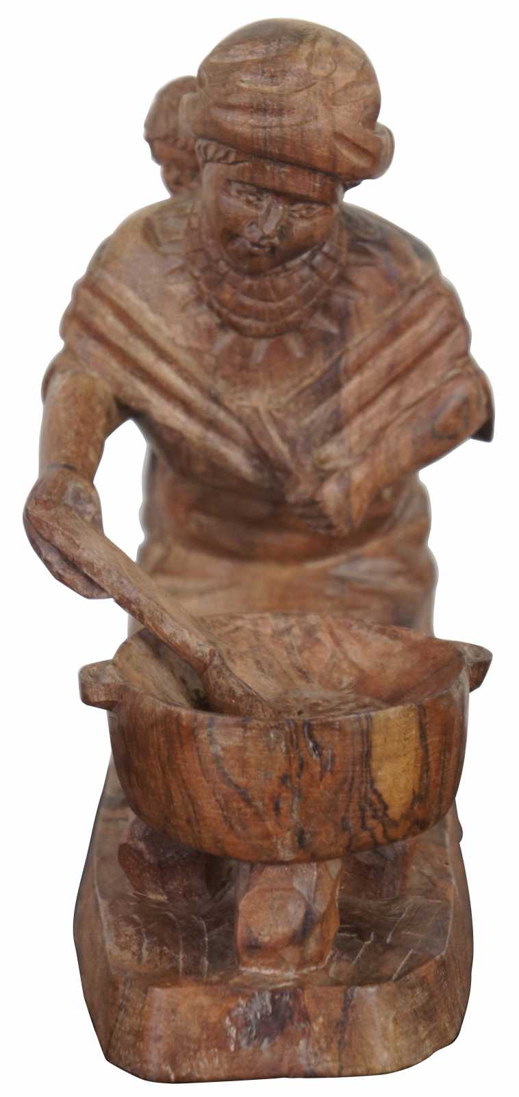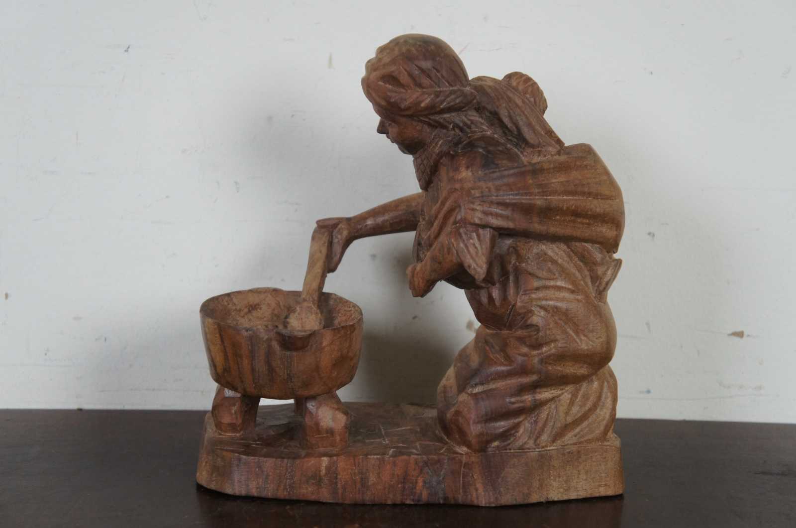Vintage hand carved folk art figurine of a native woman in a shawl with a baby on her back, kneeling by and stirring a cooking pot.