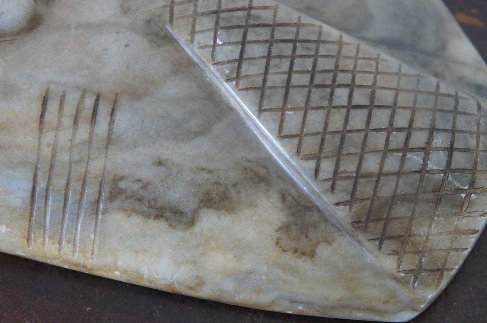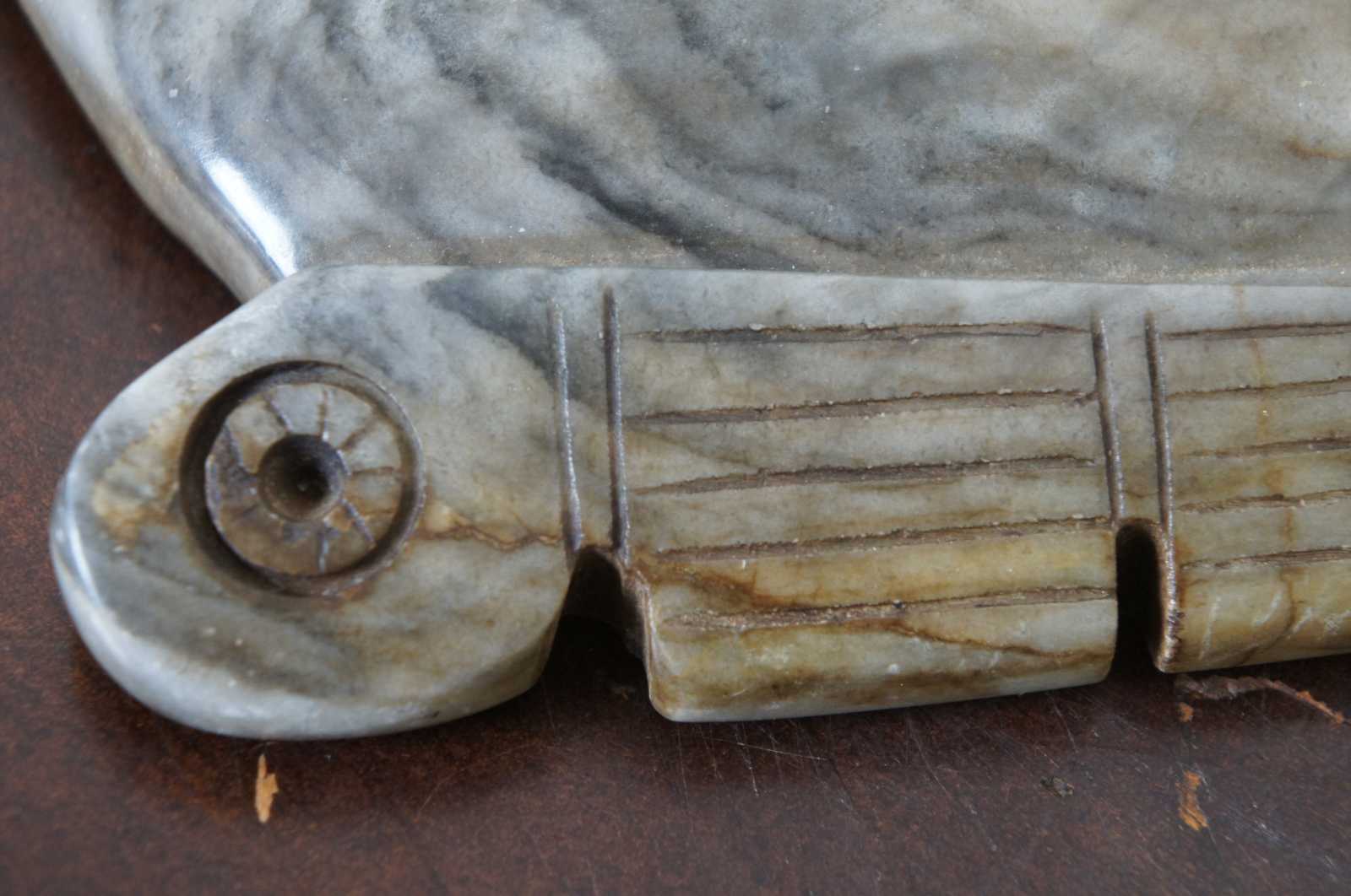Vintage carved brown and gray stone wall hanging mask in the style of an Aztec or Mayan face with ornate earrings and a tall hat emblazoned with two snake heads.