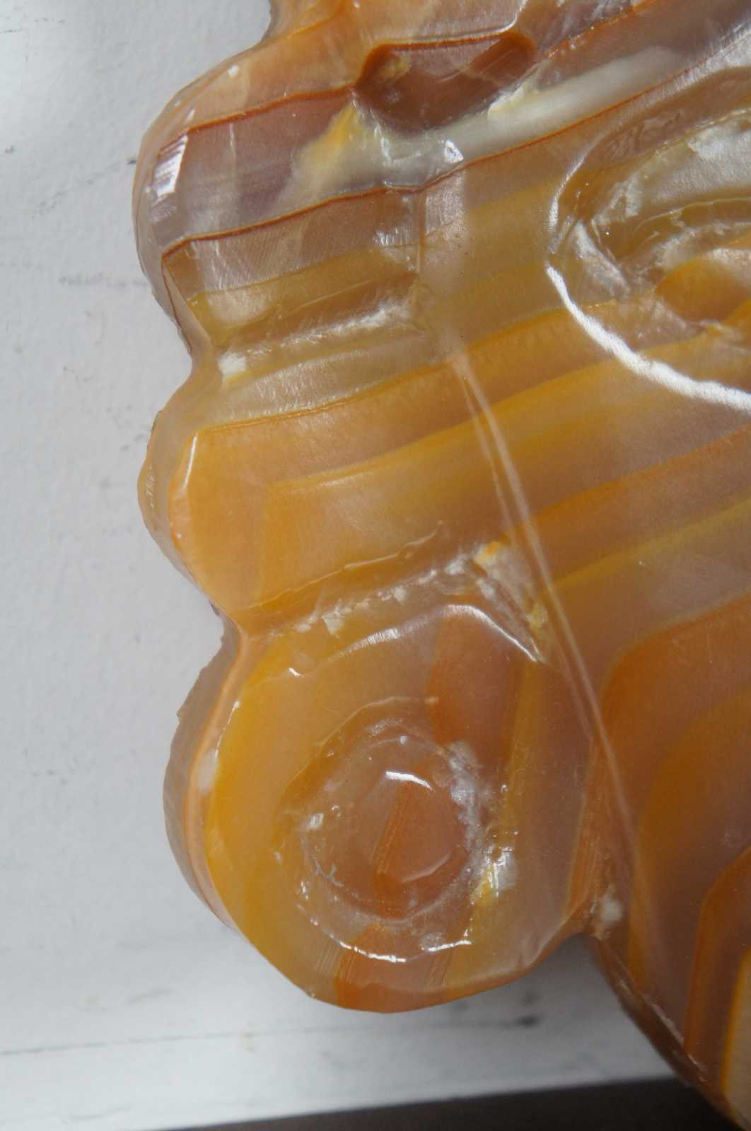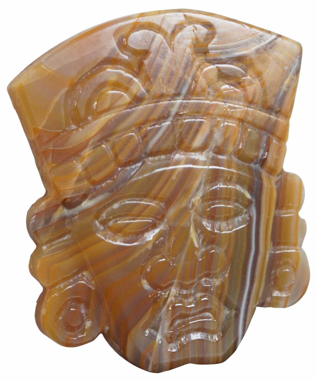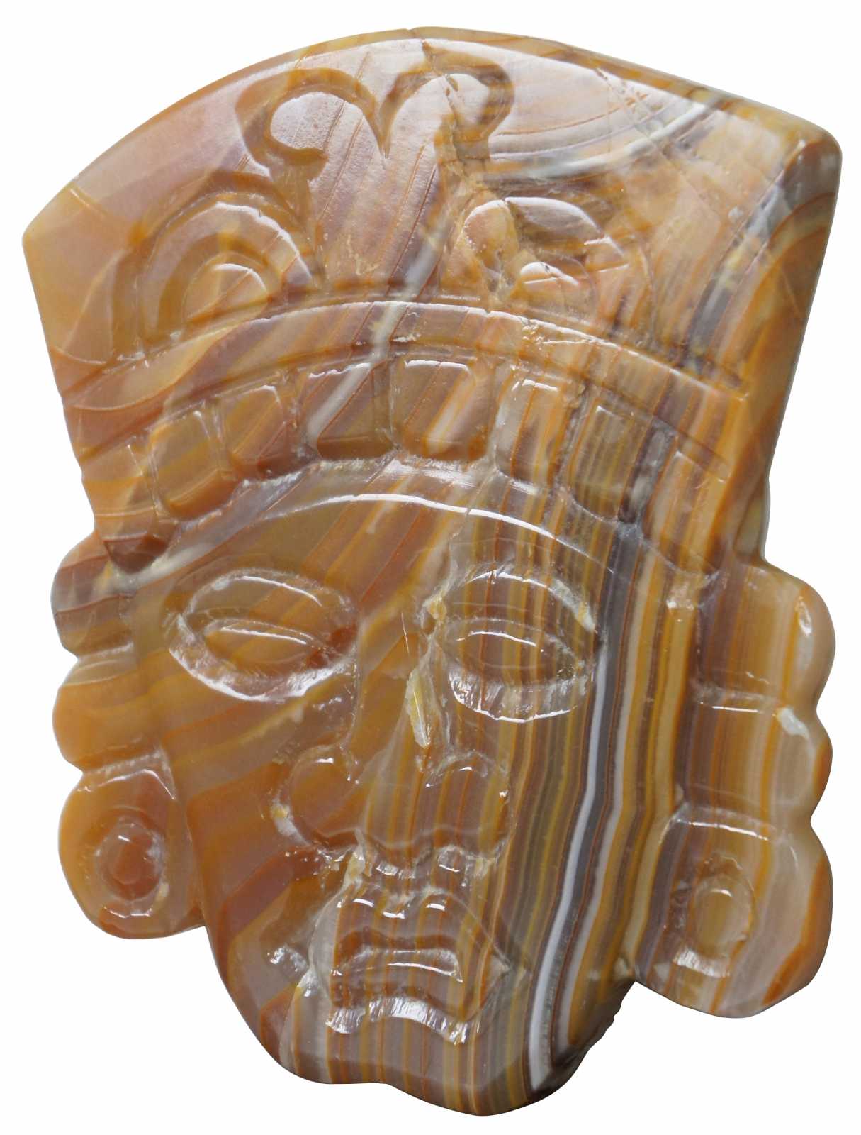 Carved orange and white agate wall hanging face resembling an Aztec or Mayan style mask.