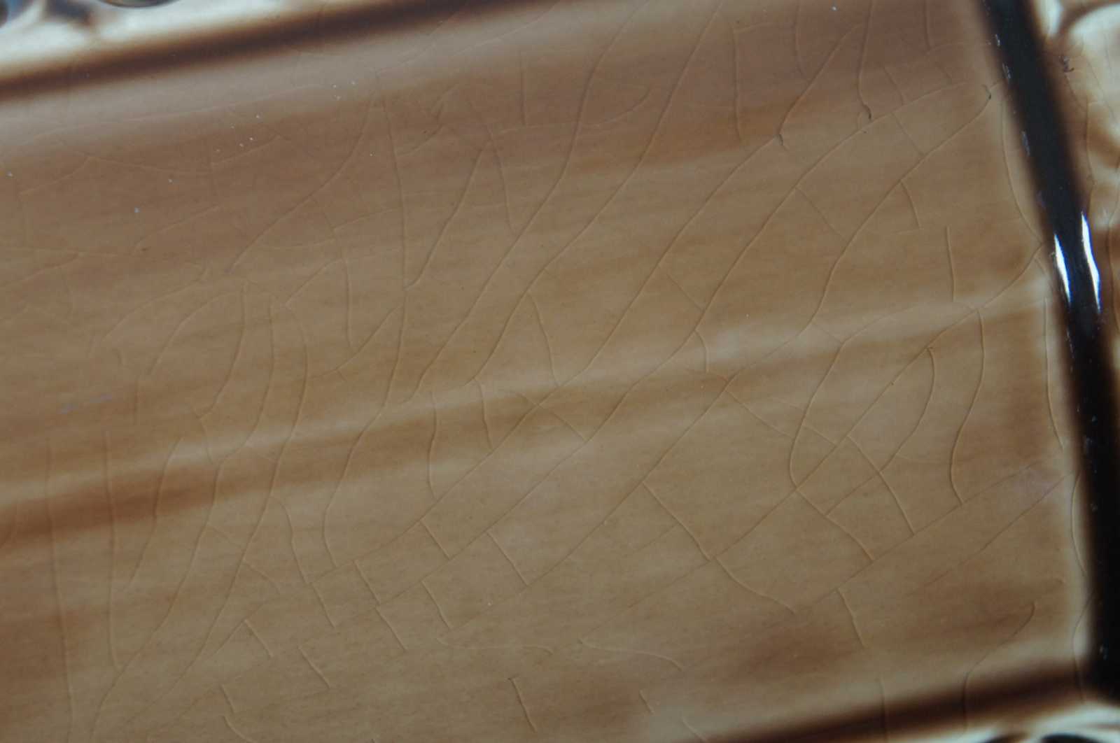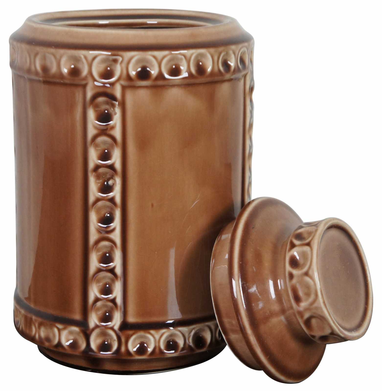 Vintage McCoy product number 254 brown drip glaze cookie jar with thumbprint border and lid.