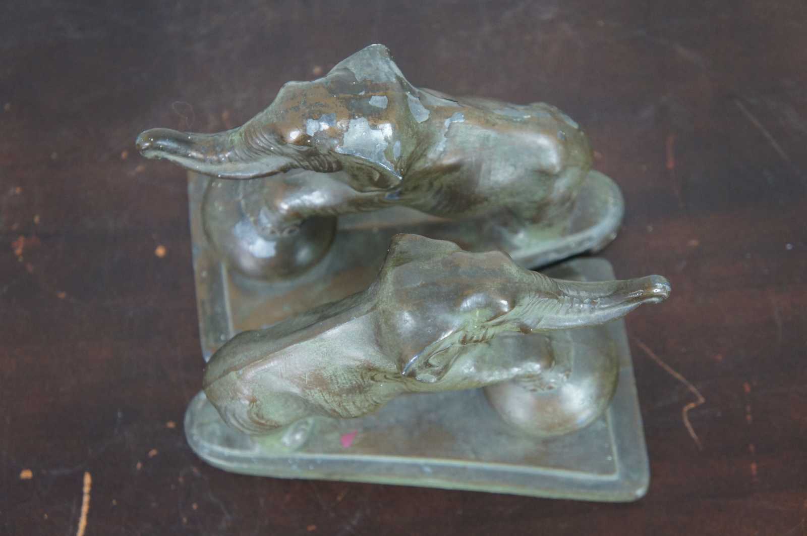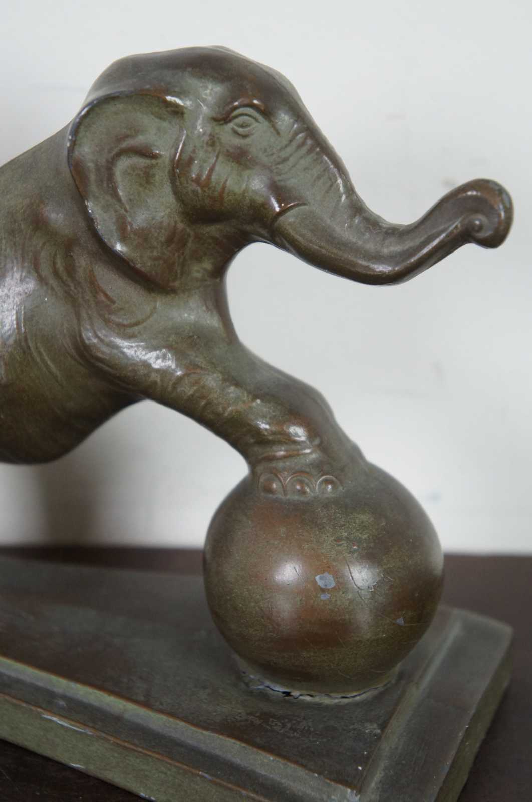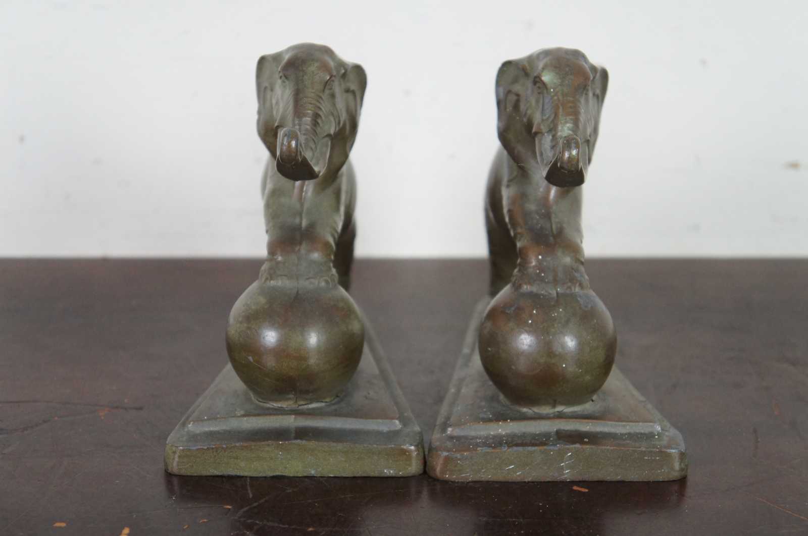 Antique art deco metal bookends in the shape of elephants with raised trunks, front feet balanced on a large ball and triangular base.